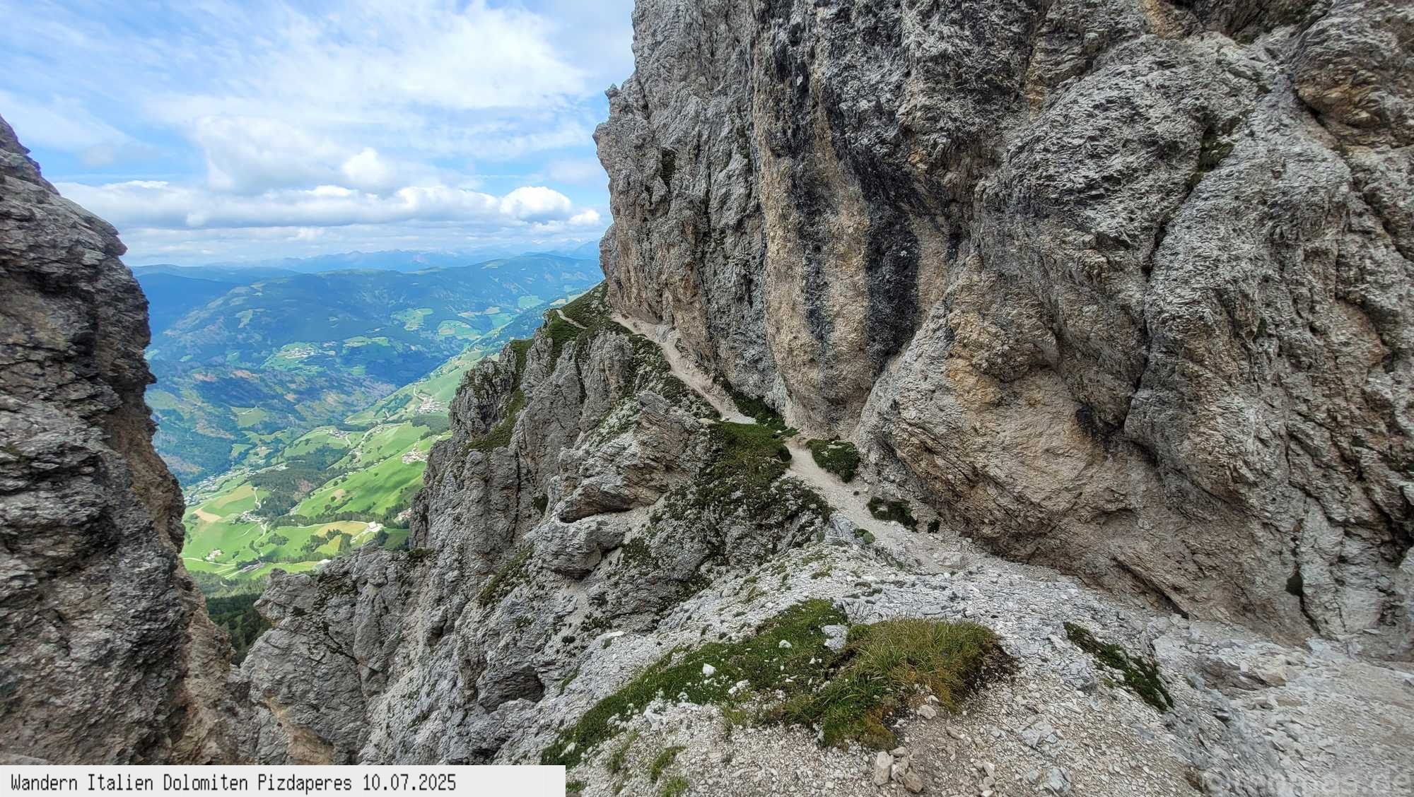 Keinerlei Seilversicherungen, im oberen Teil ausgesetzt und nur für Geübte geeignet.