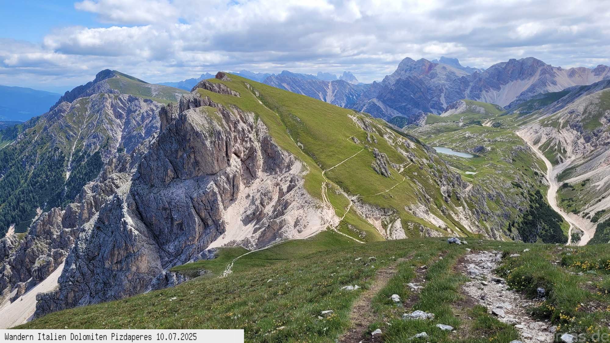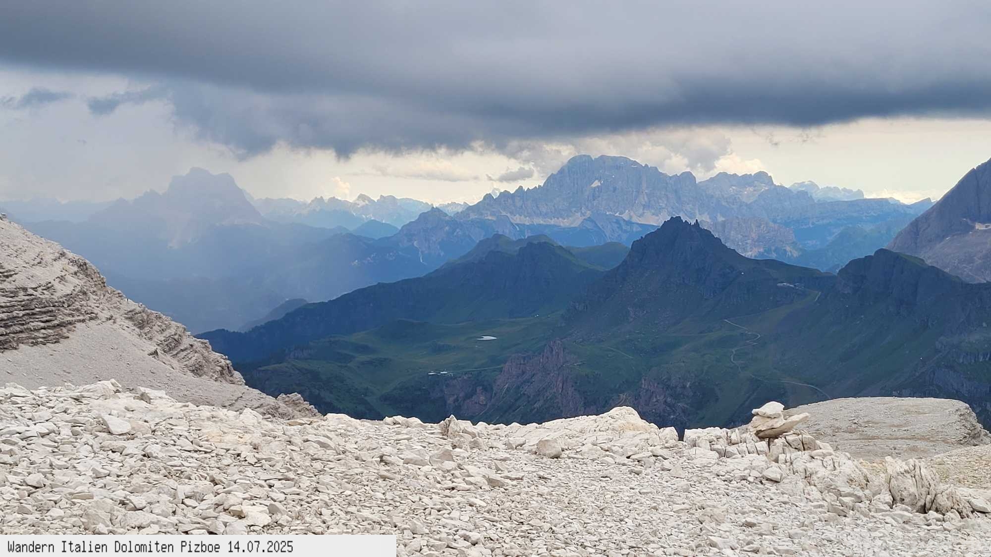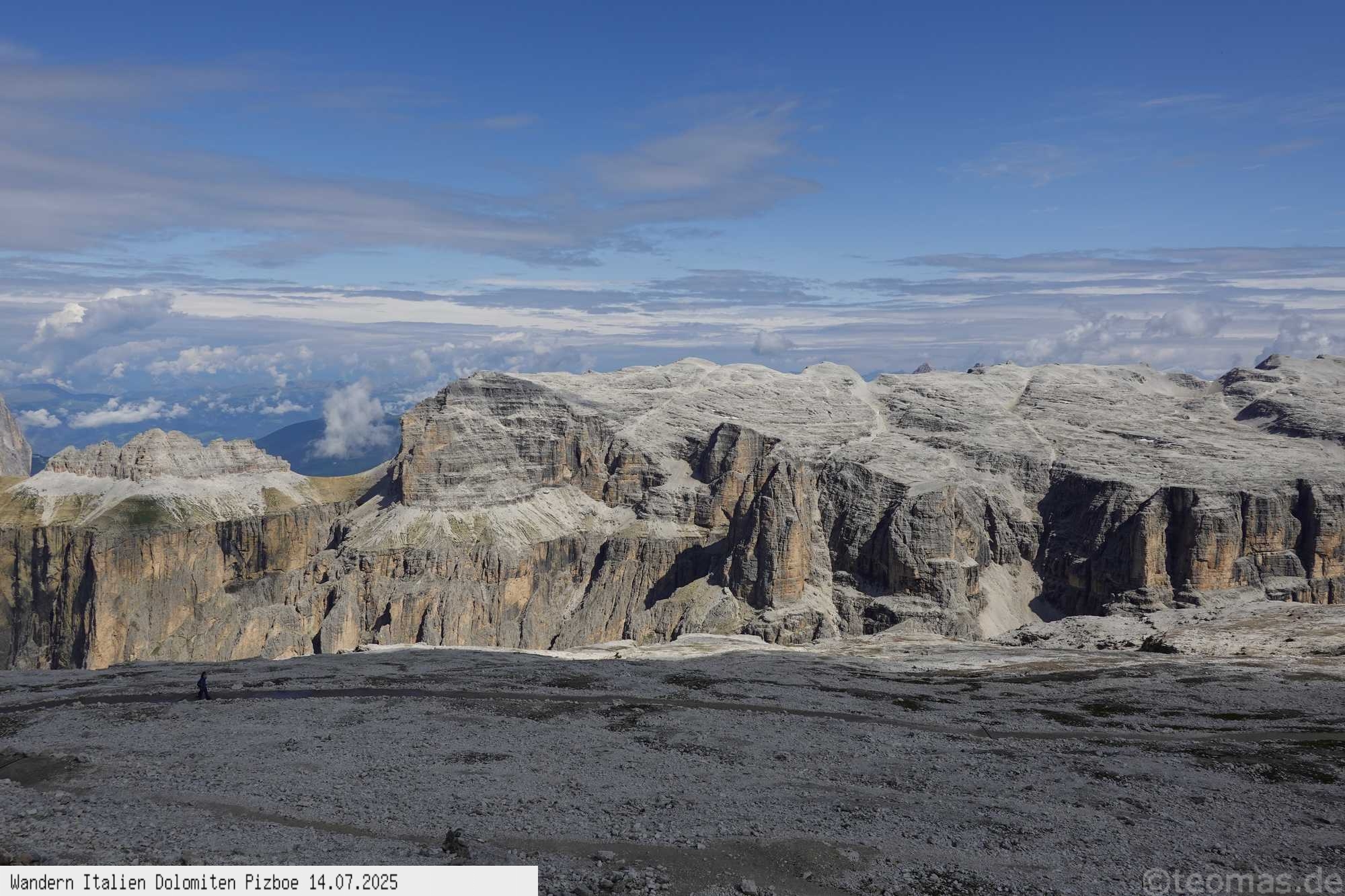 In Richtung Süden der Kreuzkofel, die Marmolada, der Peitlerkofel und viele andere Gipfel. Der Rückweg führt erst ein steiles Schotterfeld hinunter,