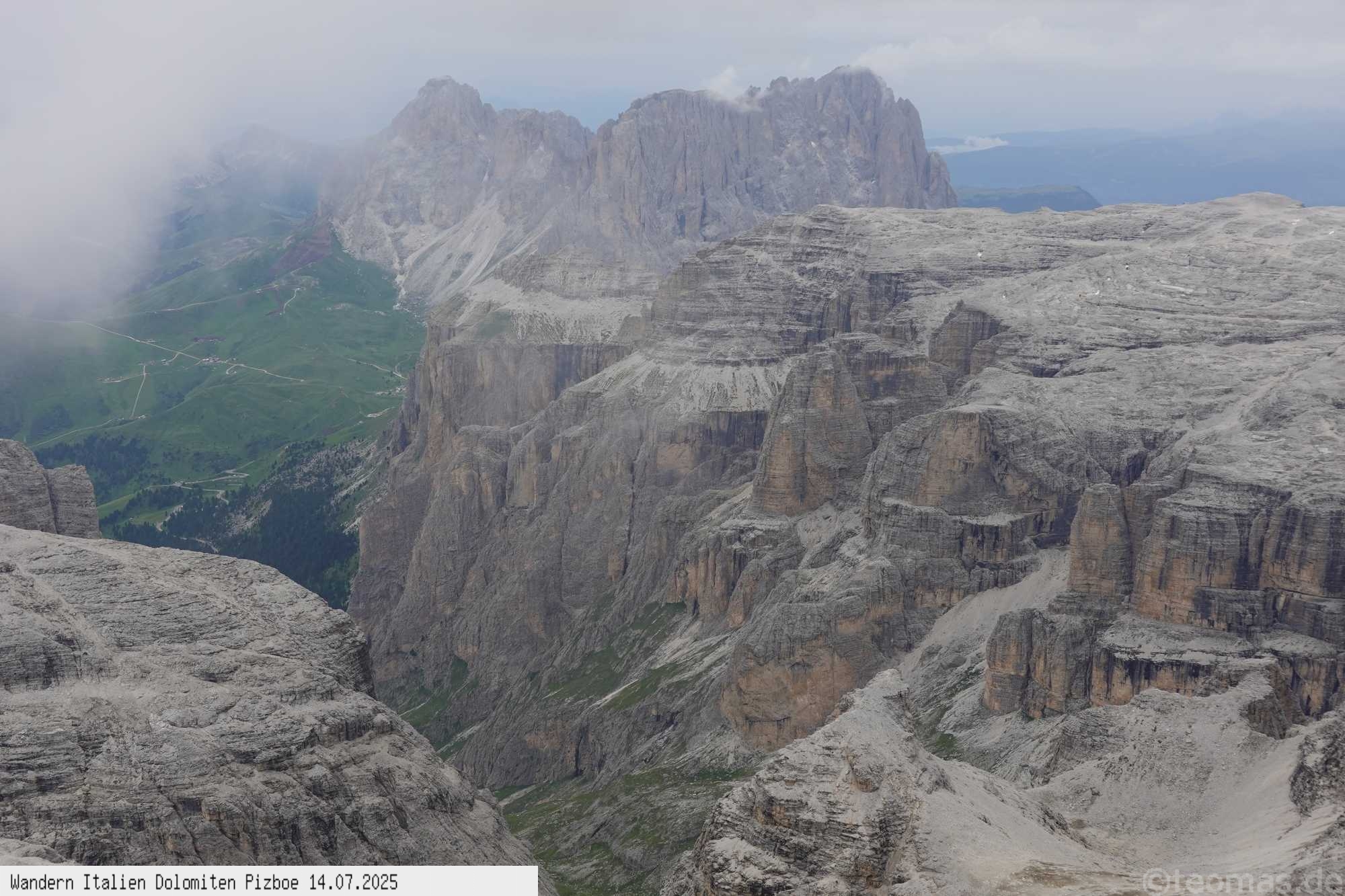 Atemberaubende Tiefblicke zur Grödner-Joch-Strasse sowie auf die umliegende Region. Gehzeit ca. 03:30 Stunden mit Aufstieg von 700 Hm und als