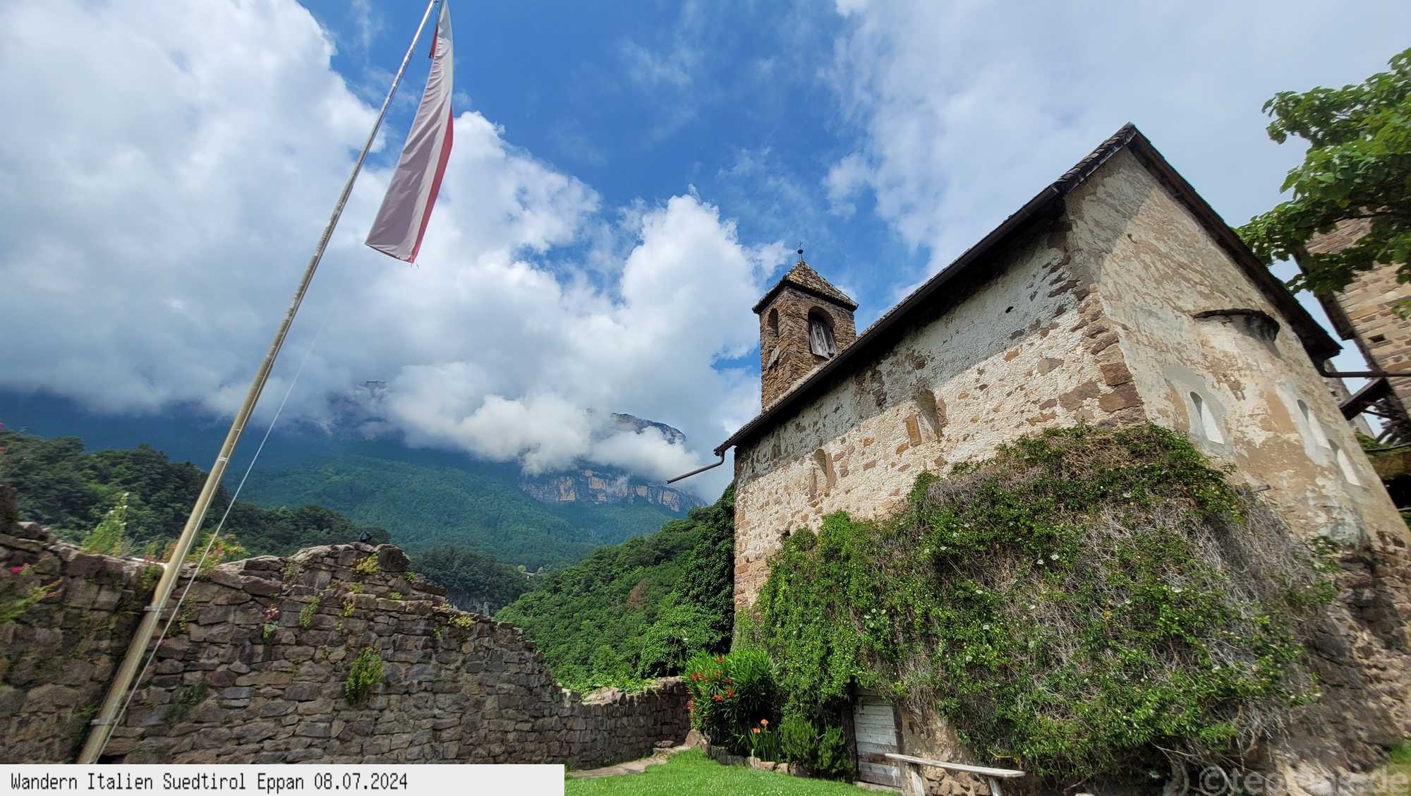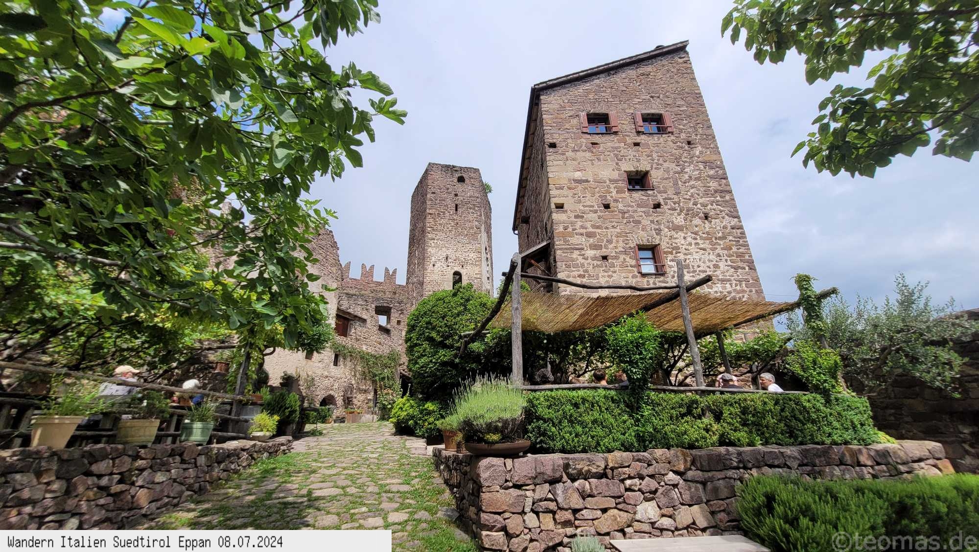 zum Kreideturm und nach Burg Hocheppan im Wald. Die Burg aus dem 12. Jahrhundert bietet heute eine Biergarten mit mittelalterlichen Flair.