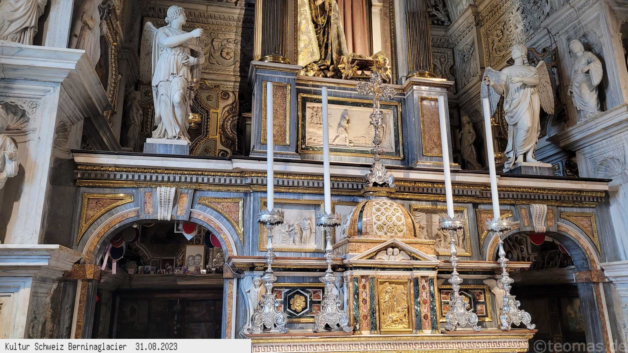 mit Mittagsrast am Hauptplatz, danach gegen 14 Uhr Besichtigung der Wallfahrtskirche Madonna di Tirano, mit überladener Innenarchitekur und schöner