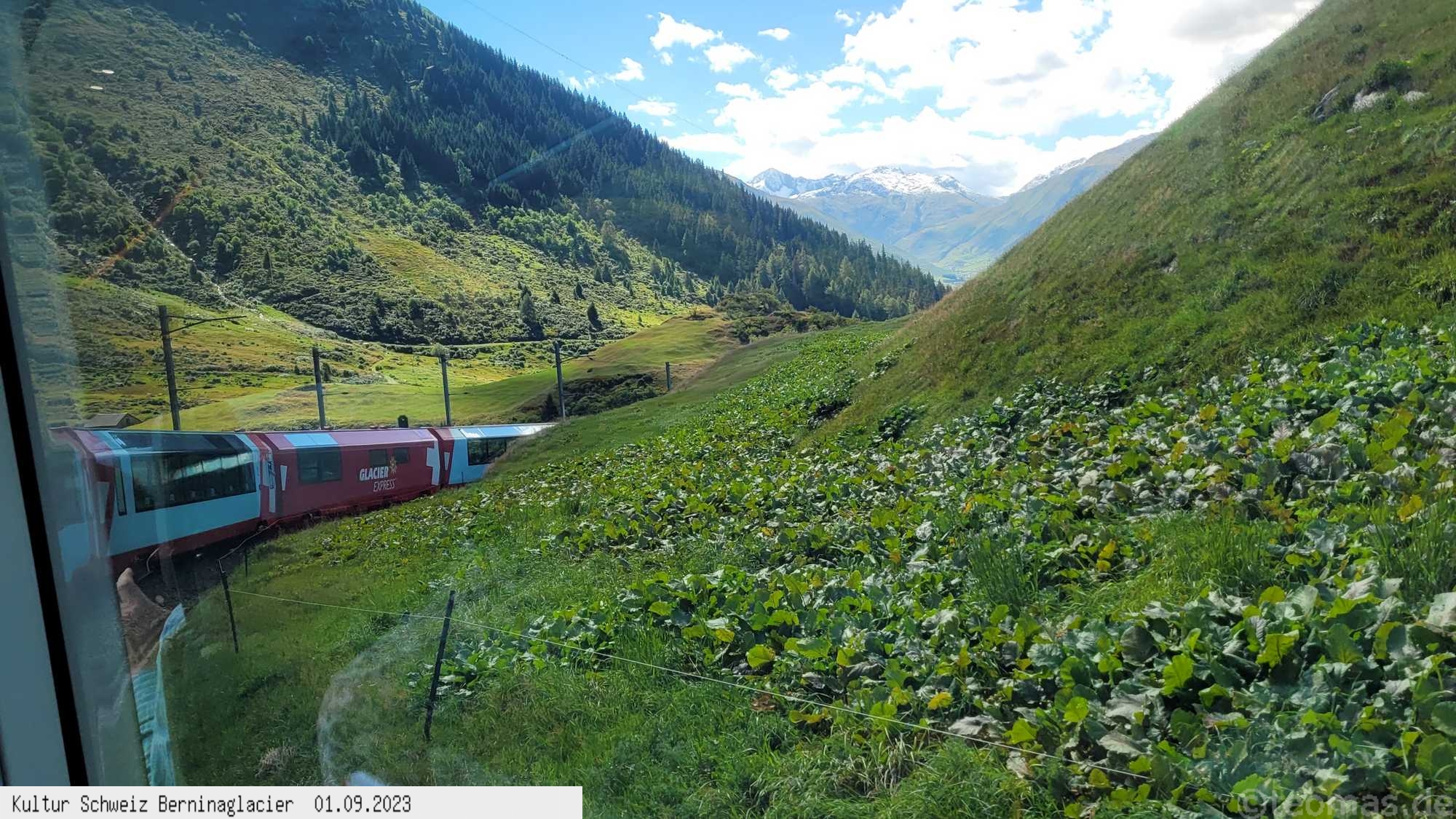 der aufgehenden Sonne in den frischen grünen Wiesenhängen ging es mit dem Zug Bernina Express (UNESCO Welterbe) um 9 Uhr ab St. Moritz über Pontresina