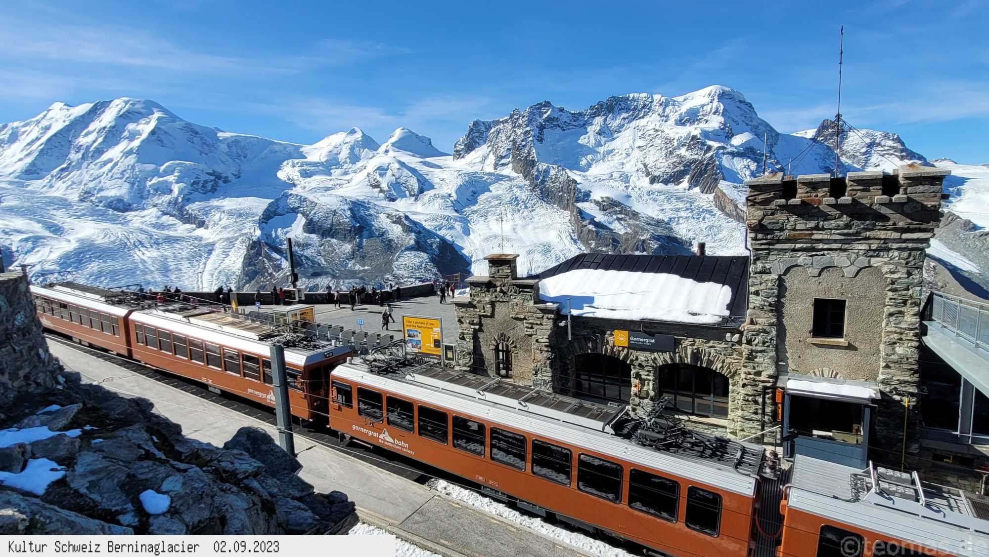 Unterwegs immer wieder spektakuläre Ausblicke auf das Matterhorn im Sonnenlicht, und bei der Ankunft gegen 09:30 Uhr am Gornergrat