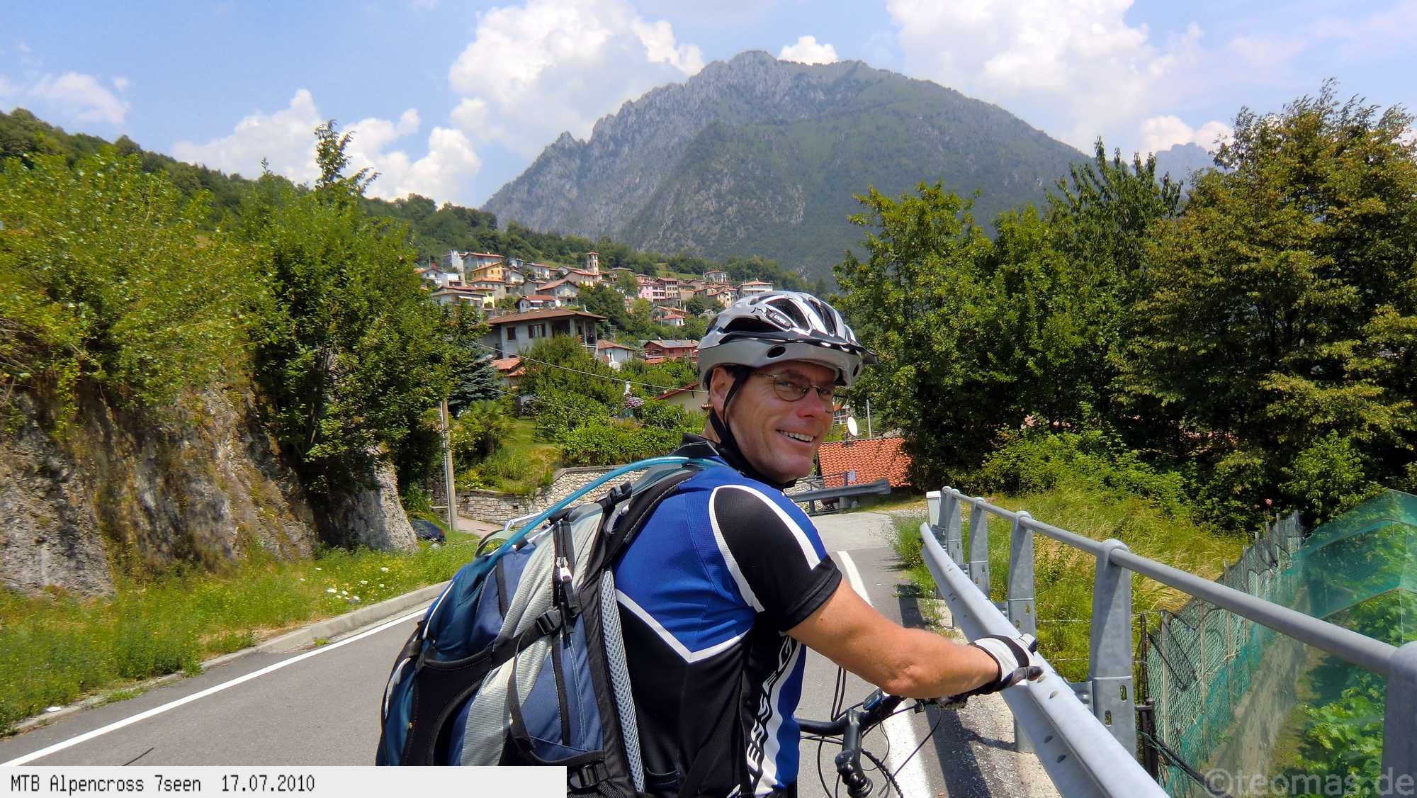 Von West nach Ost auf der Alpensüdseite vom Lago Maggiore zum Gardasee. Auf ehemaligen Militärstraßen und alten Handelswegen an sieben Seen vorbei. Die Infrastruktur auf dieser bisher schwierigsten Alpendurchquerung ist schwach ausgebaut. Man gelangt durch teils einsame und stille Gegenden, in denen längere Abschnitte ohne Versorgung zu bewältigen sind. Hitze um die 40°C und ein Bruch der Sattelstütze am ersten Tag haben die Bedingungen zusätzlich verschärft. Die Anstiege sind durchwegs sehr steil, oft unfahrbar. Die Wegfindung erfordert Erfahrung und ausreichend Geduld im Kartenlesen an kritischen Weggabelungen. Belohnt wird man durch ein abenteuerliches Gelände auf nicht ausgetretenen Pfaden. Um die Tour logistisch zu meistern sind wir mit dem Auto von Nürnberg nach Ticino/Locarno zum Tourstart gefahren. Für den Rückweg vom Gardasee haben wir uns ein Leihauto bis zur italienisch/schweizerischen Grenze nach Belinzano genommen. Von dort dann weiter mit der S−Bahn nach Locarno zum Ausgangspunkt.