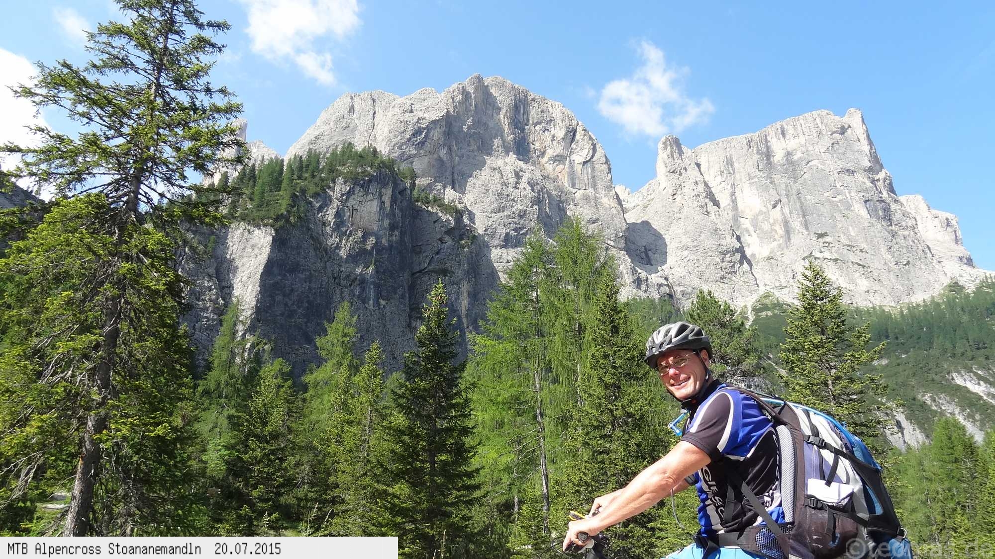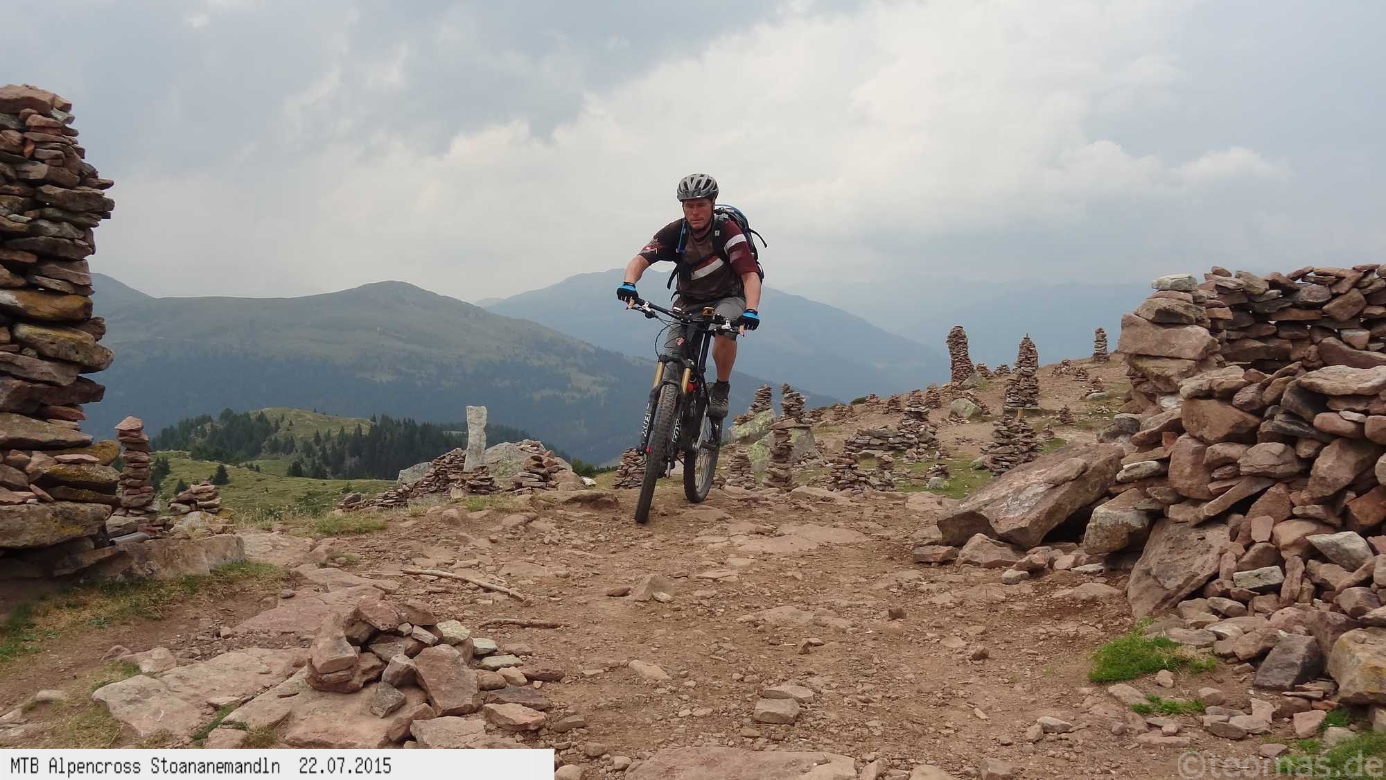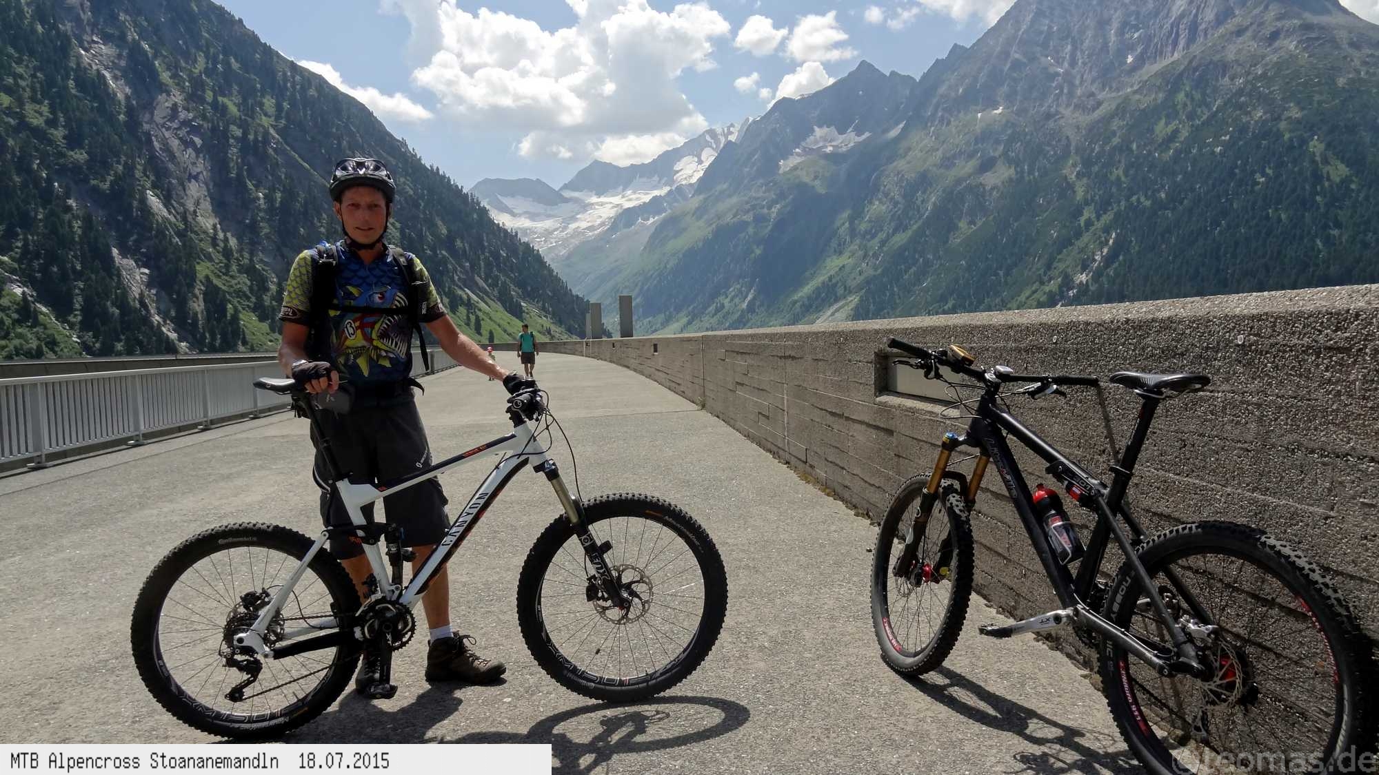 Die dem zweiten Trans-Alp Buch von Uli Stanciu entnommene Tour "Stoanane Mandln" haben wir von knapp 20.000 Hm auf ein für uns durchführbares Maß entschärft. 6 Fahrtage reichen uns völlig! Start in Kramsach am Inn, sämtliche Highlights wie das Pfitscher Joch und die Dolomiten wurden gefahren. Ziel in Eppan, die Schußetappen bis zum Gardasee haben wir ausgelassen. Am ersten Tag anspruchsvolle, steile Auffahrt zum Geiseljoch bei 41°C mit anschließender kalter Gewitter-Dusche bei 10°C hinunter nach Tux.