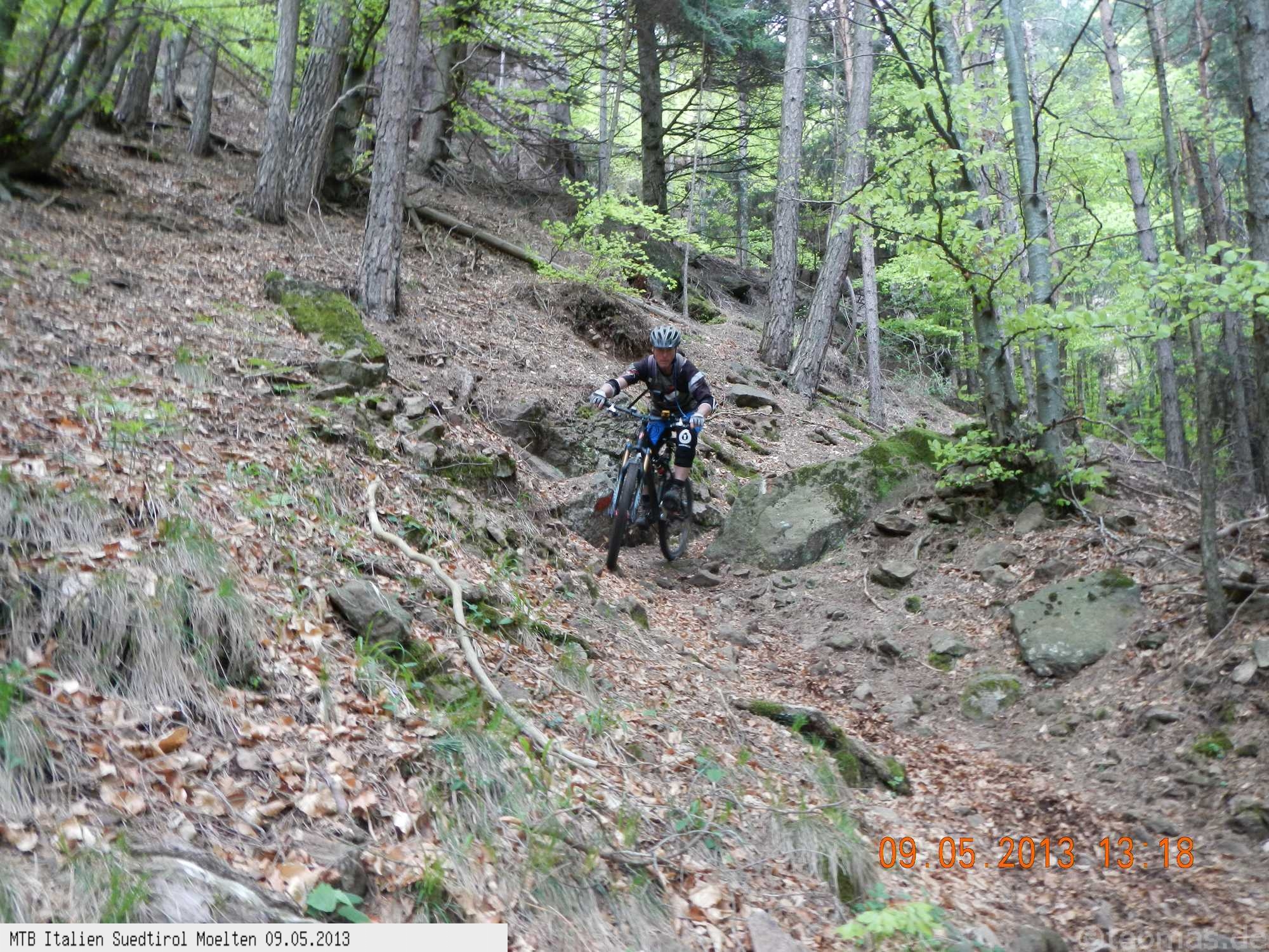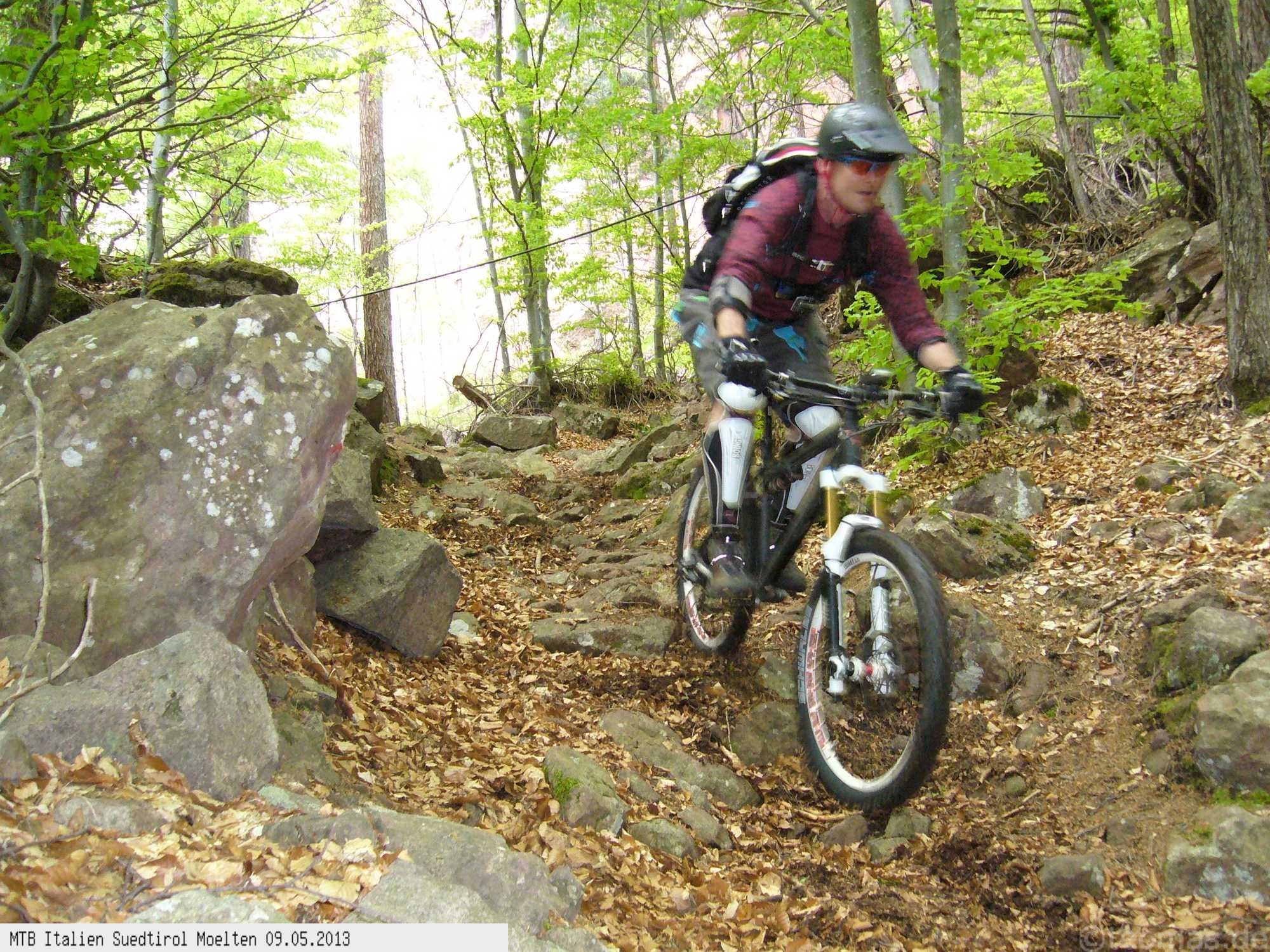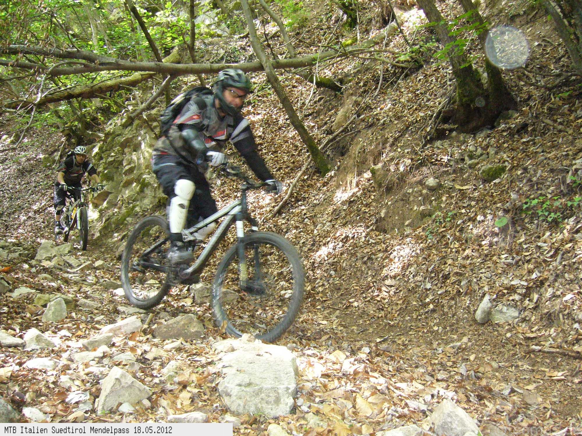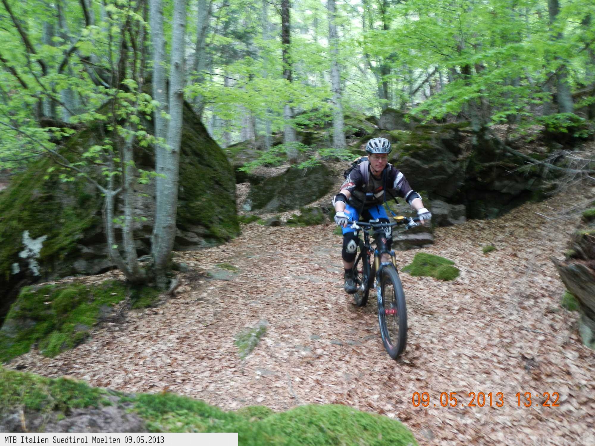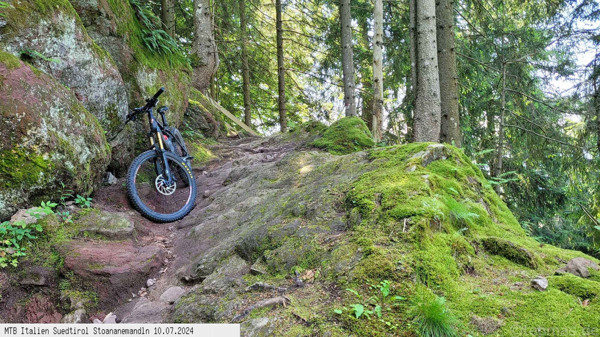 Technisch flowiger Trail, ab der Paß Querung im Wald mit anspruchsvollerem verblocktem Trails bis zur Straße nach Terlan.