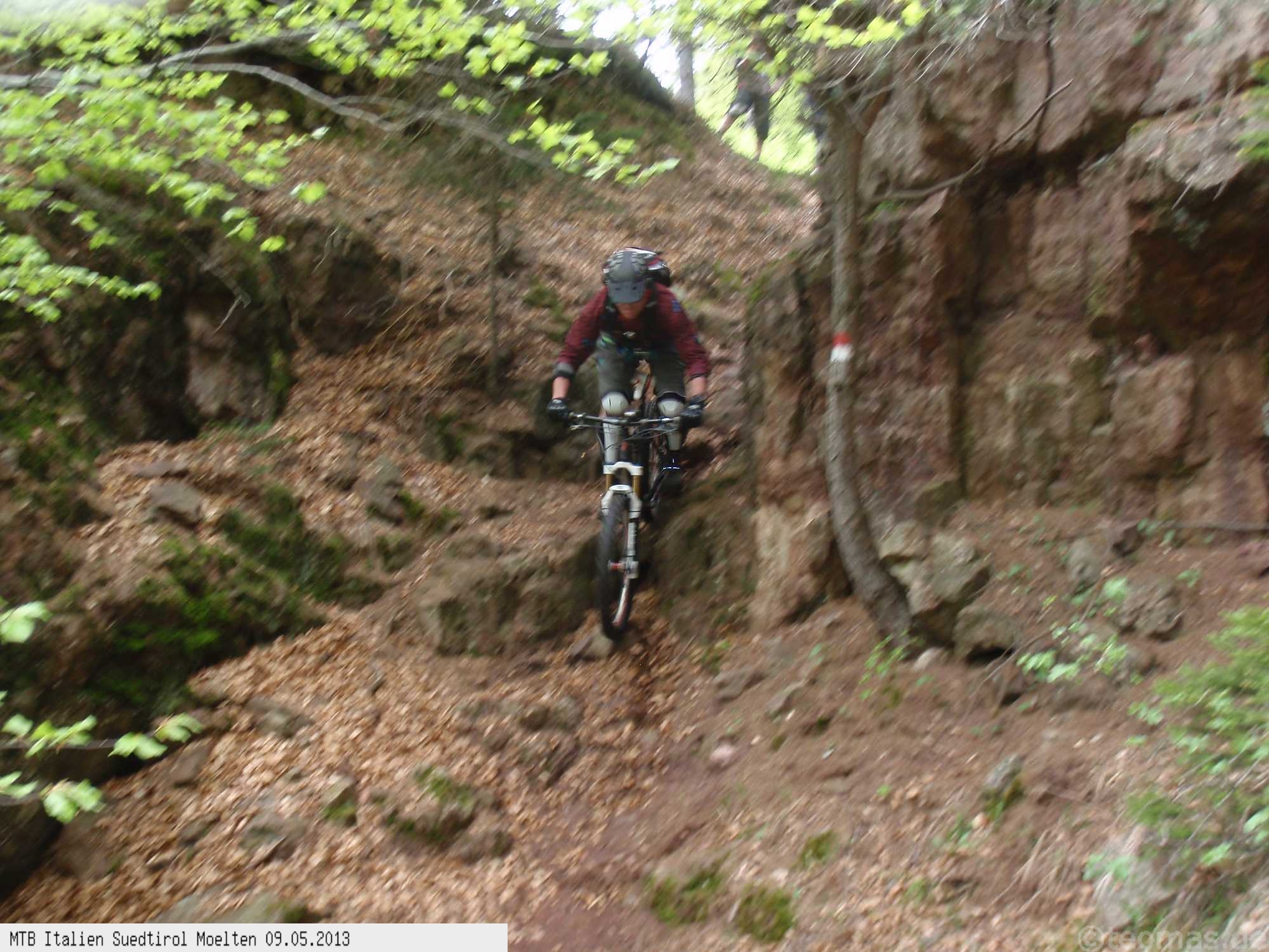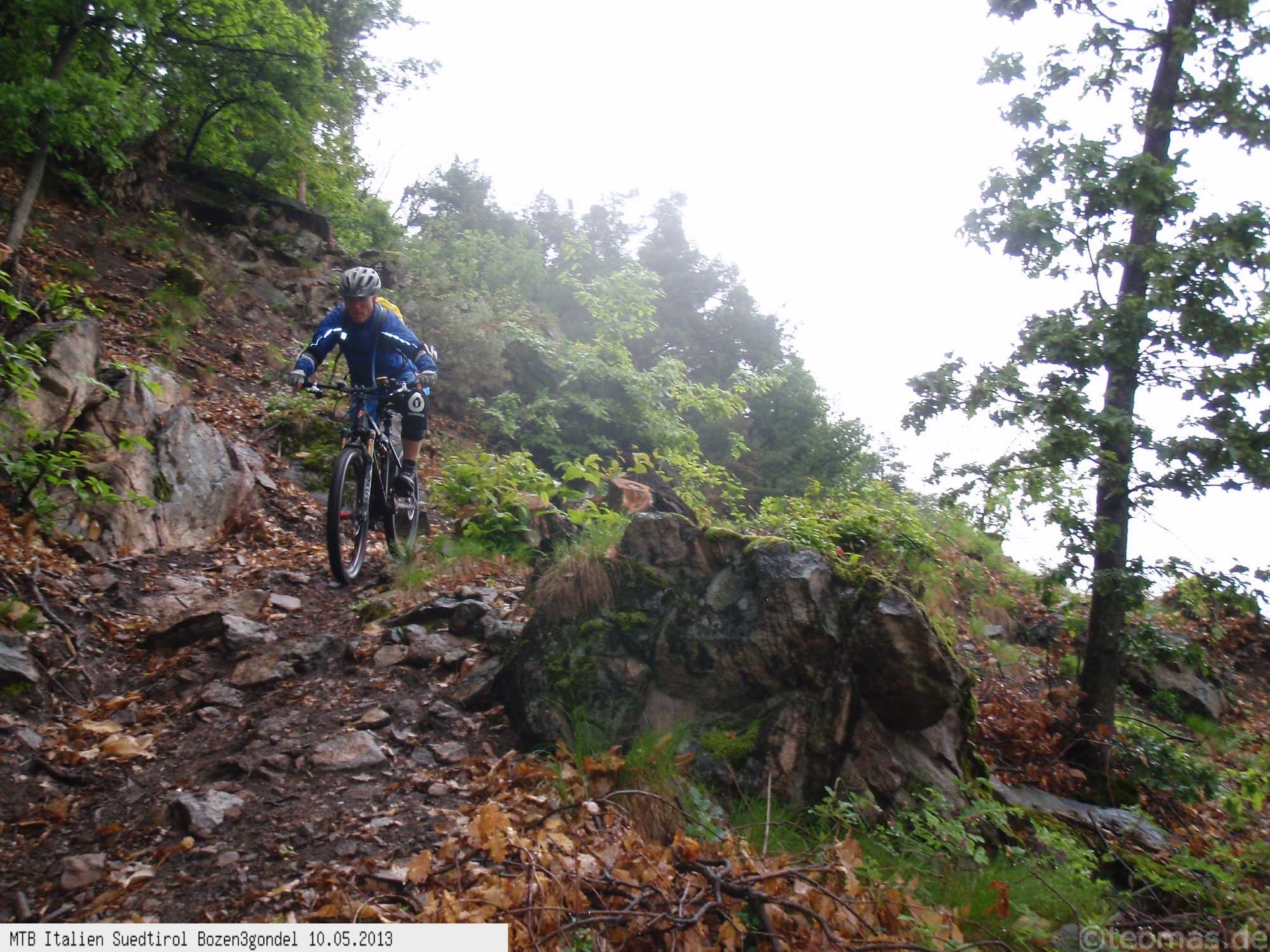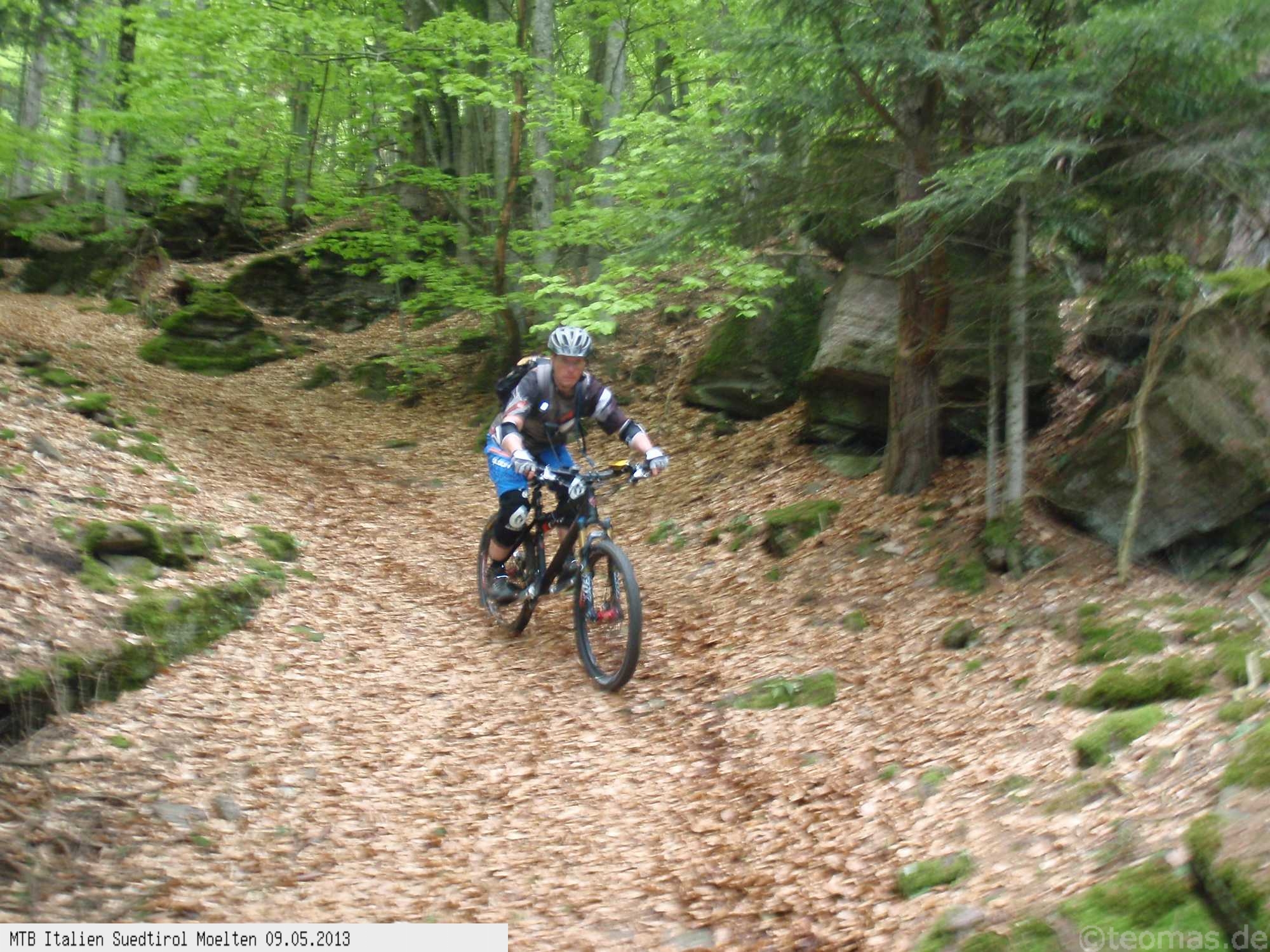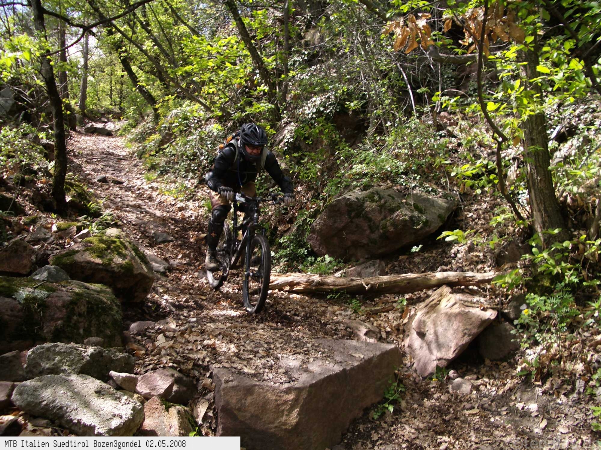 Technisch flowiger Trail, ab der Paß Querung im Wald mit anspruchsvollerem verblocktem Trails bis zur Straße nach Terlan.