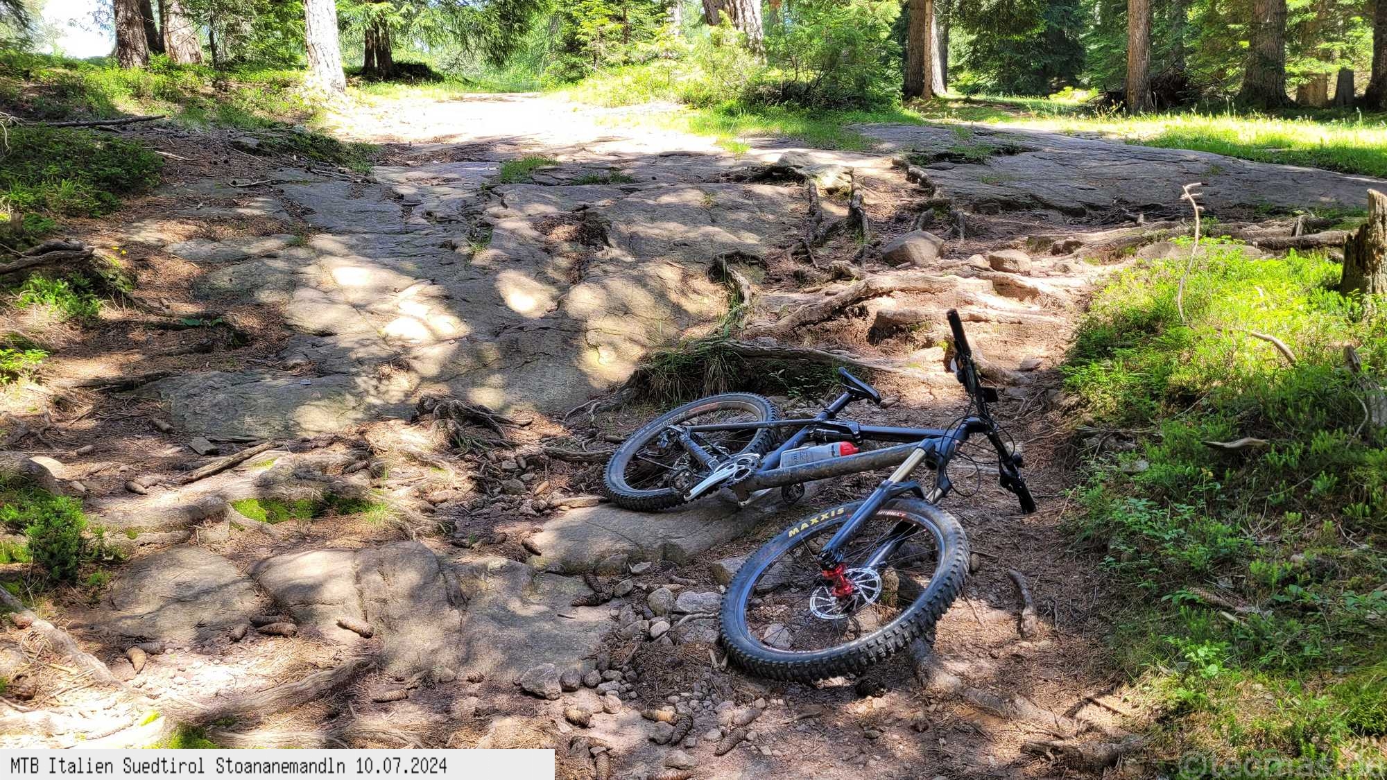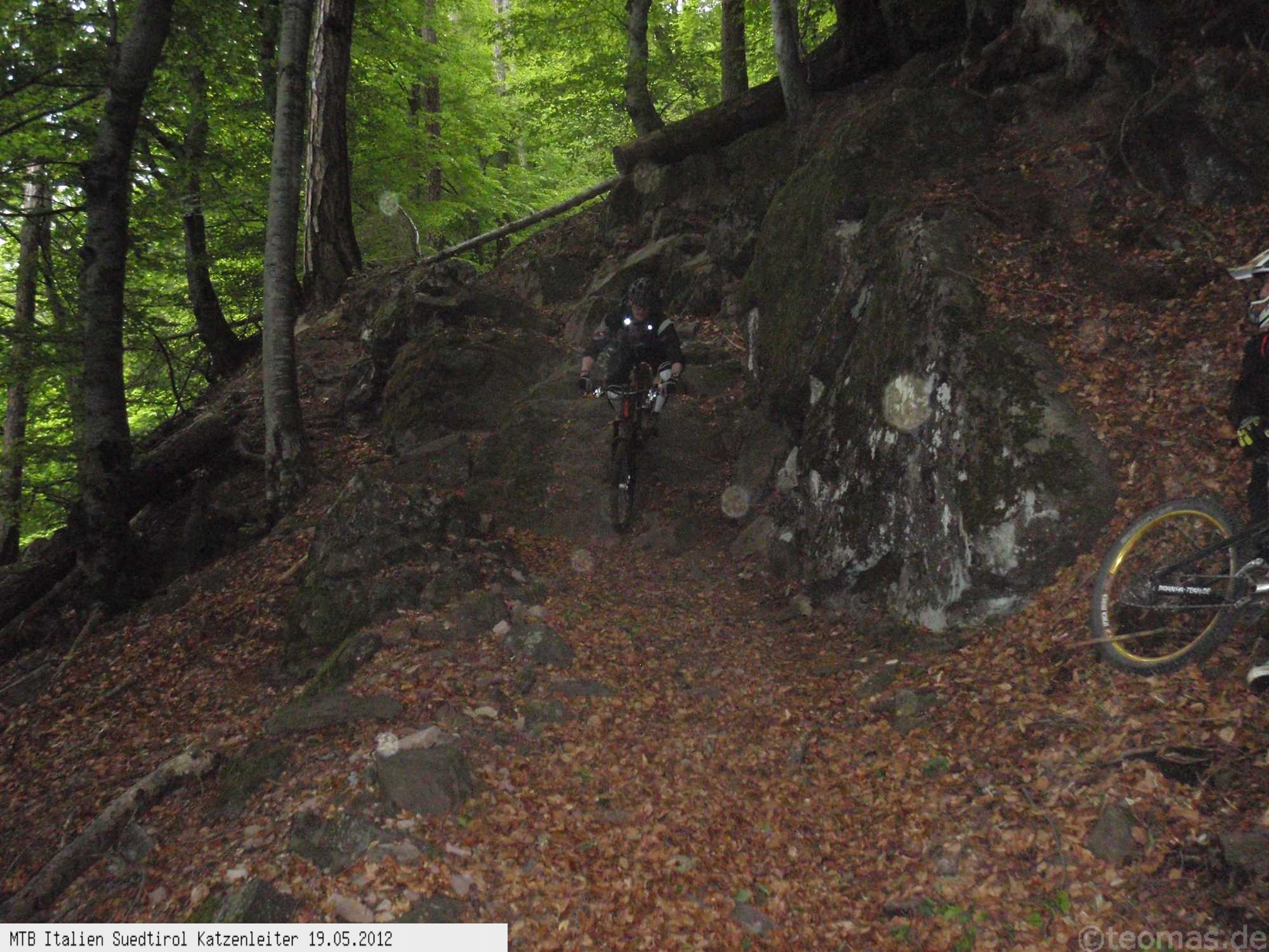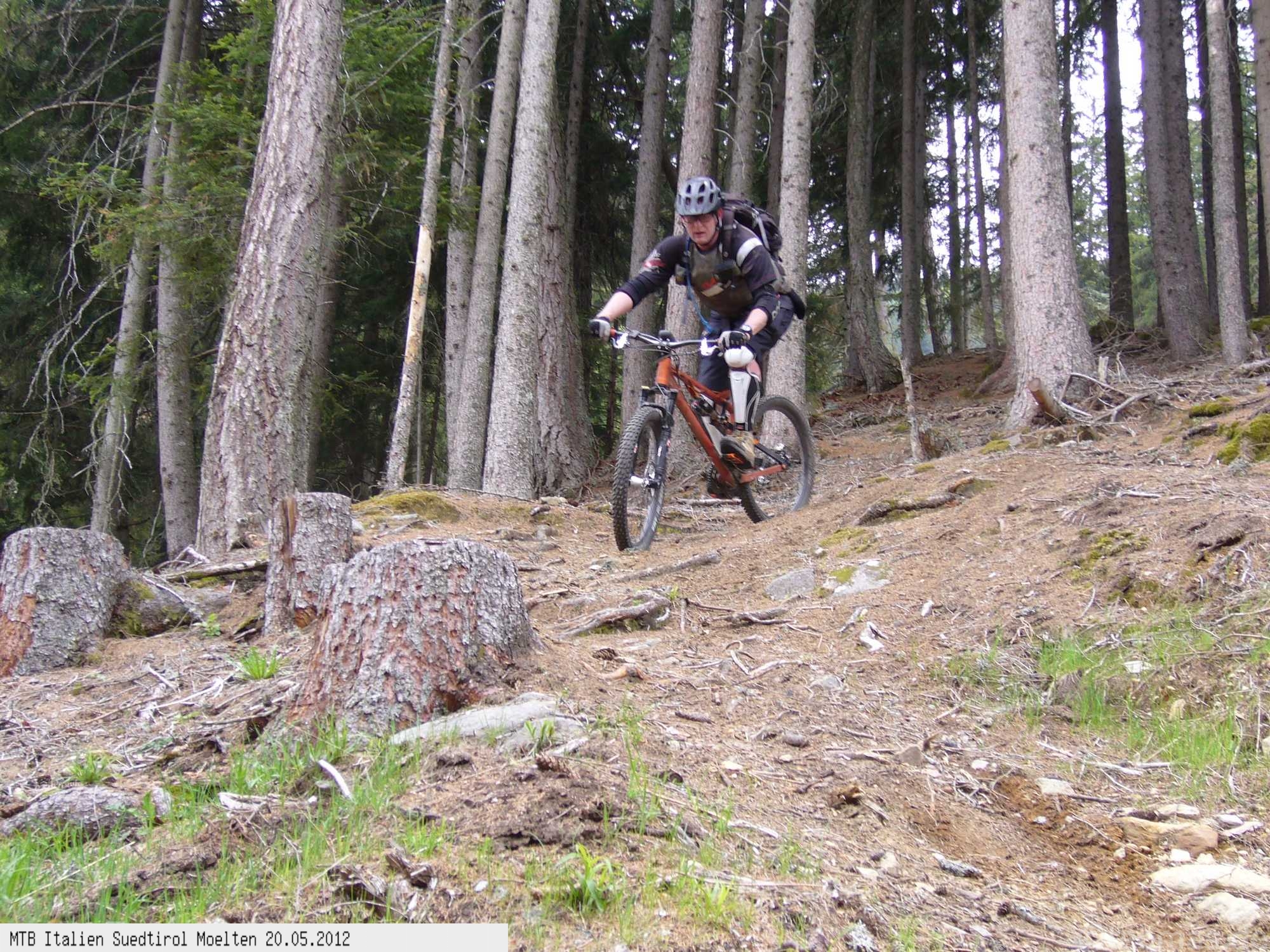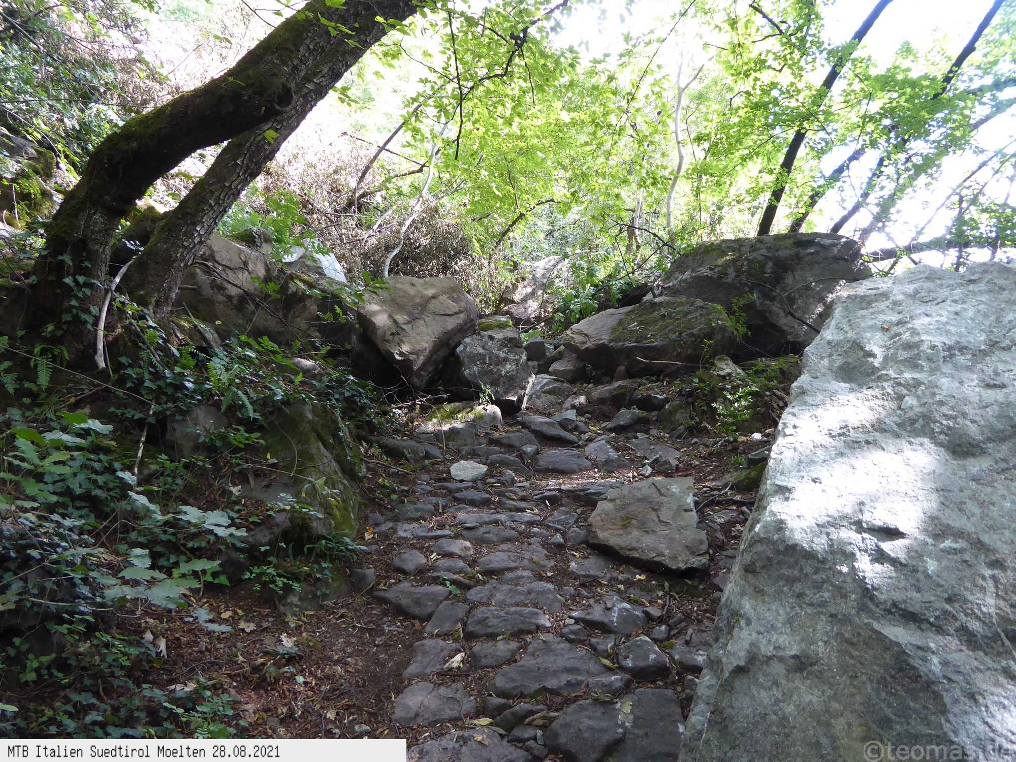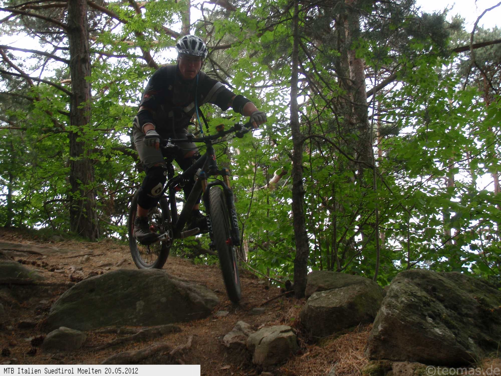 Technisch flowiger Trail, ab der Paß Querung im Wald mit anspruchsvollerem verblocktem Trails bis zur Straße nach Terlan.