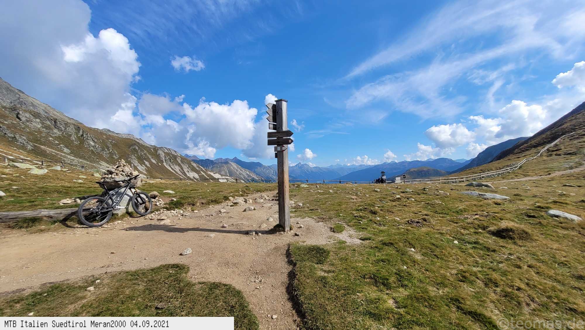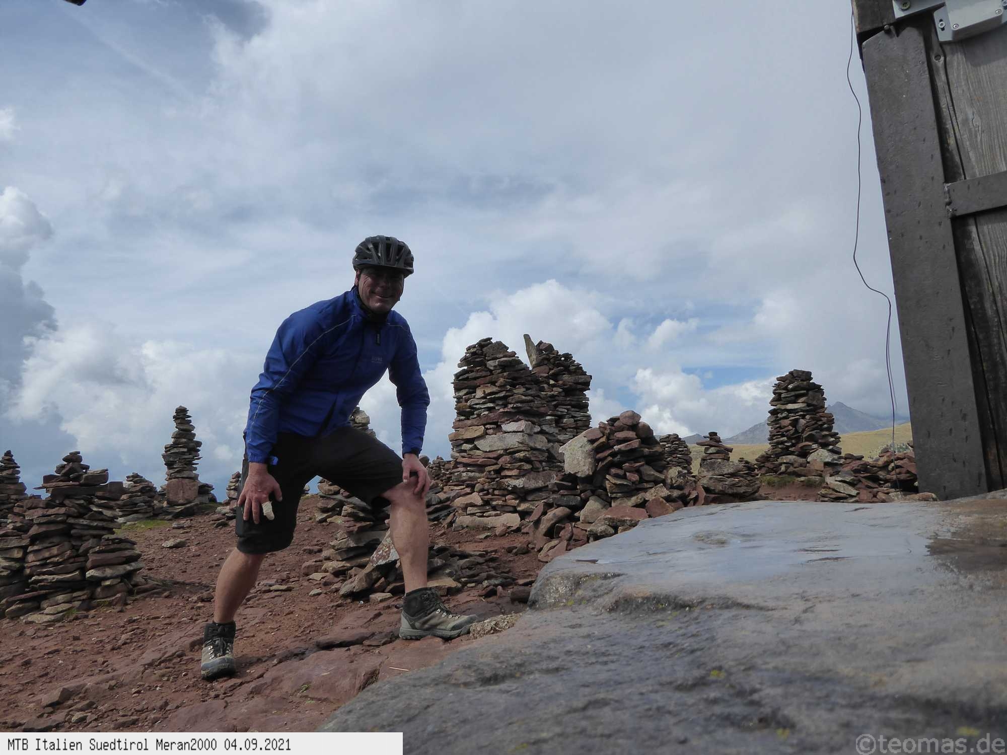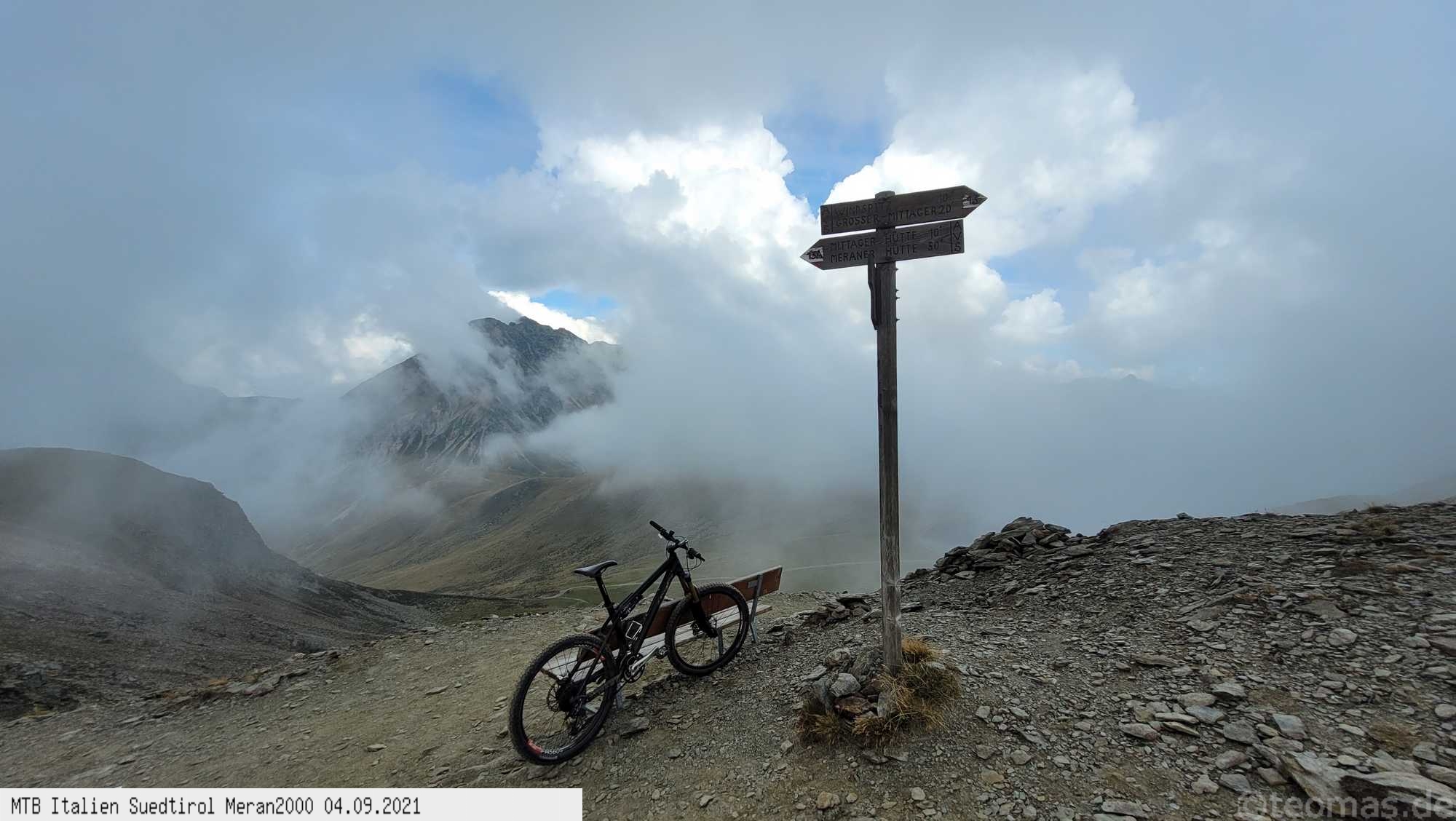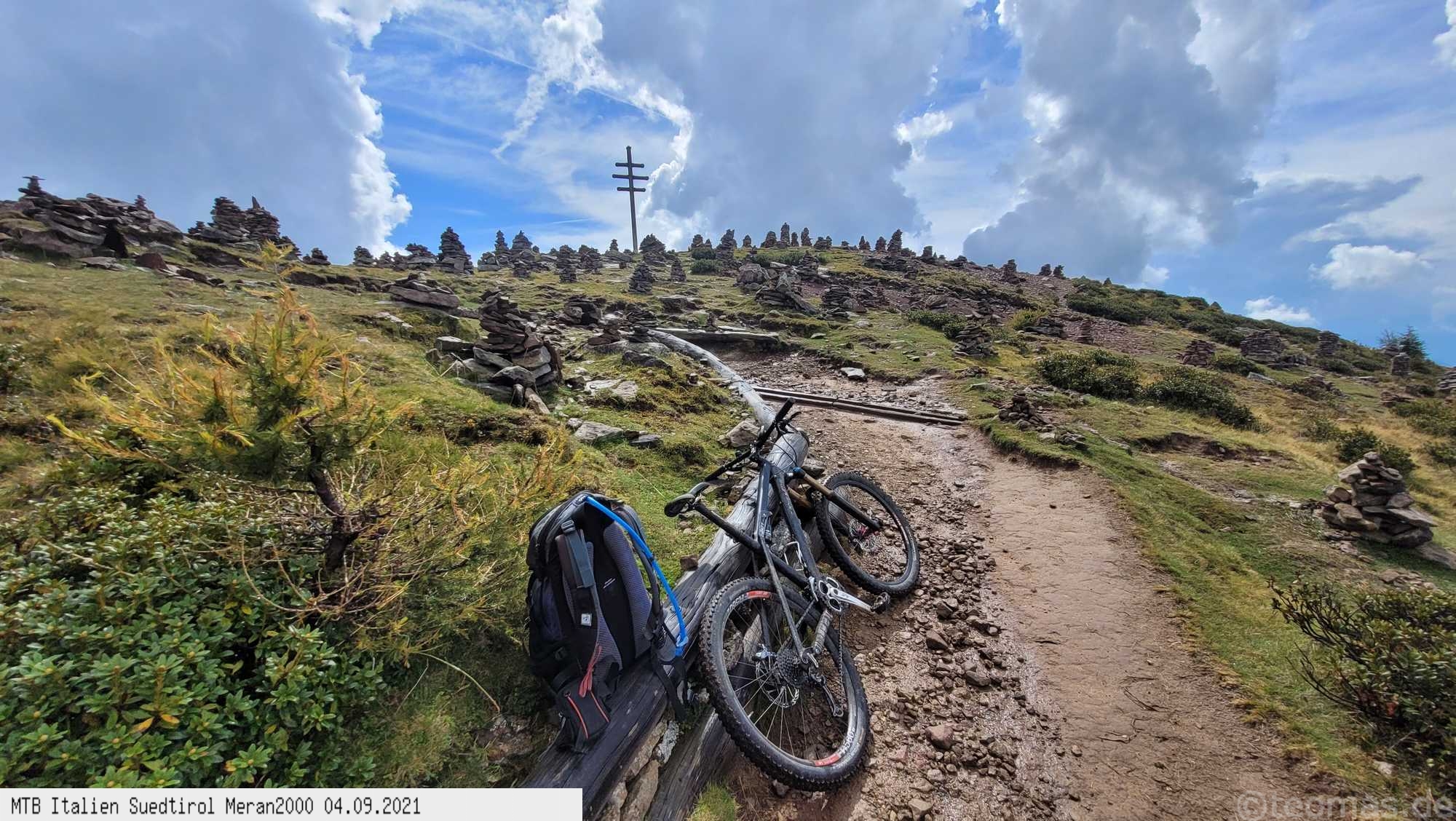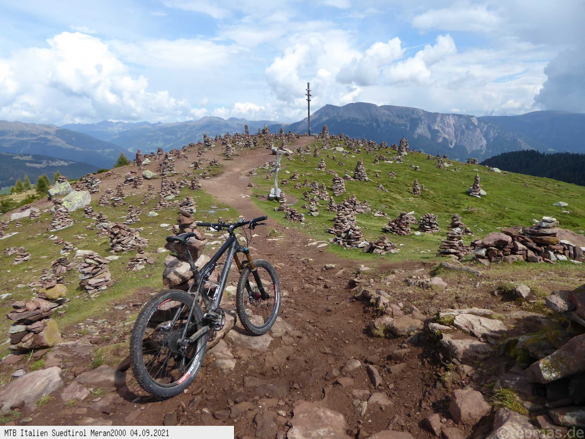 neben dem Höhenangaben Hinweisschild. Alternativ die ebenfalls schwere MTB Trail Tour vom Penegal zum Mendelpass und hinunter nach Kaltern fehren.