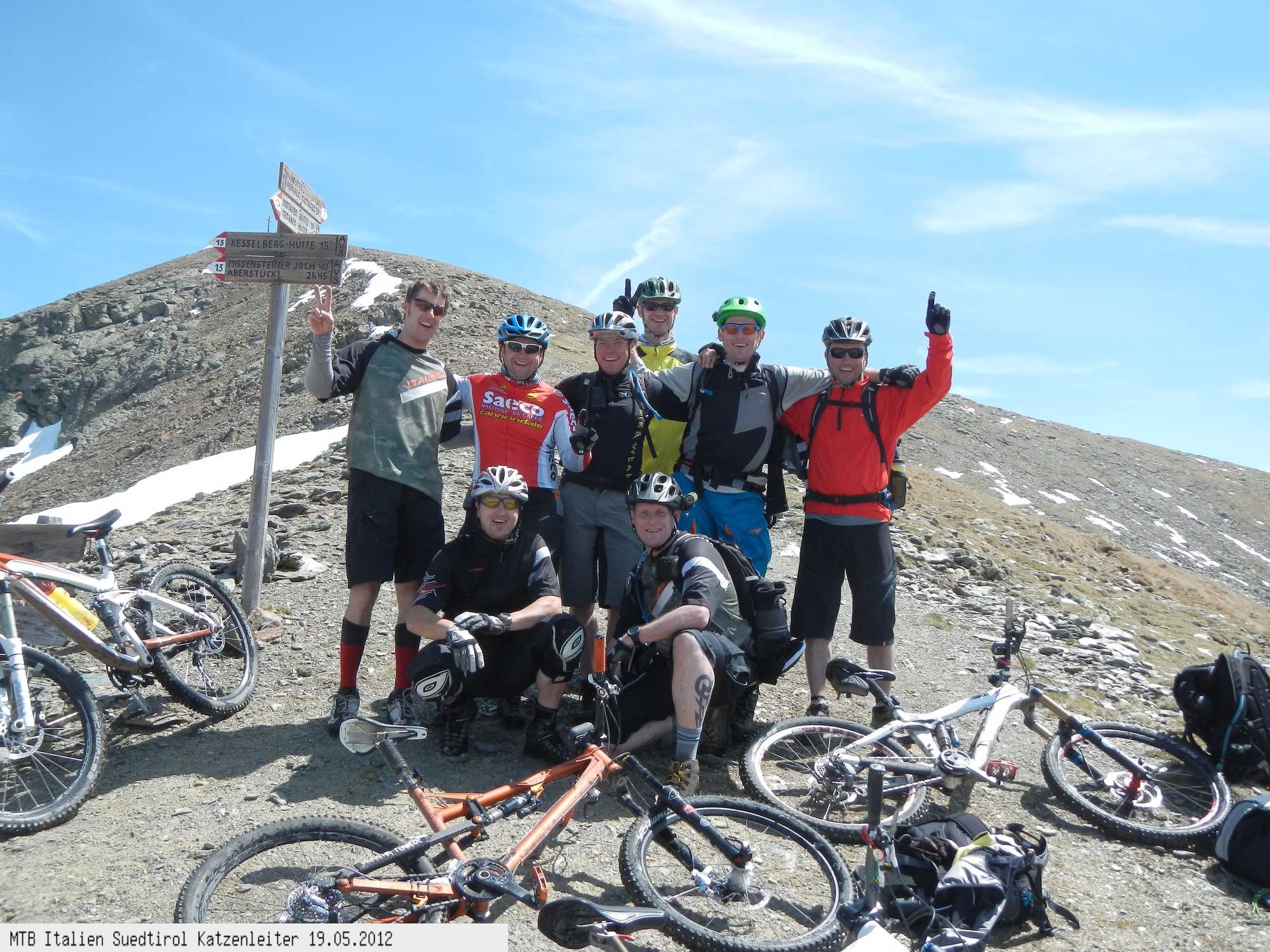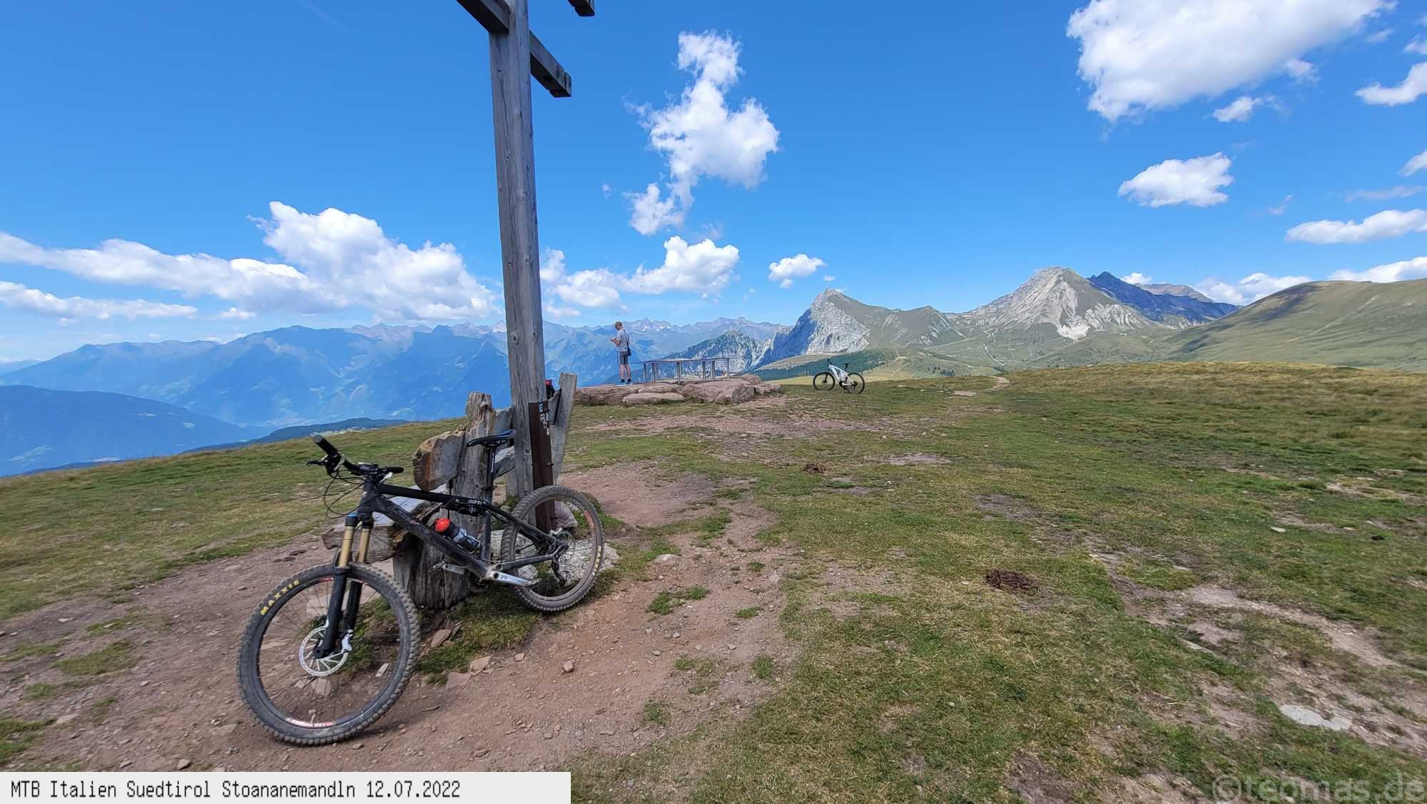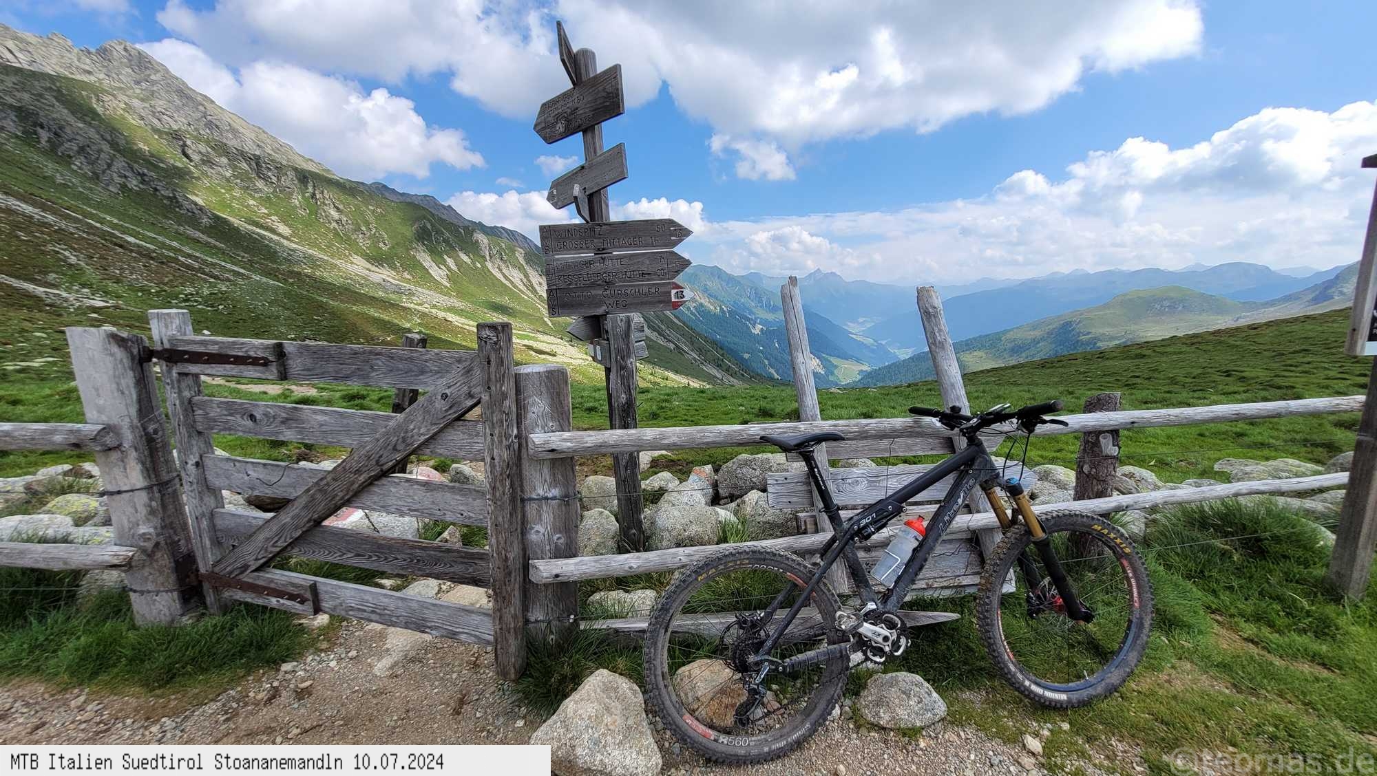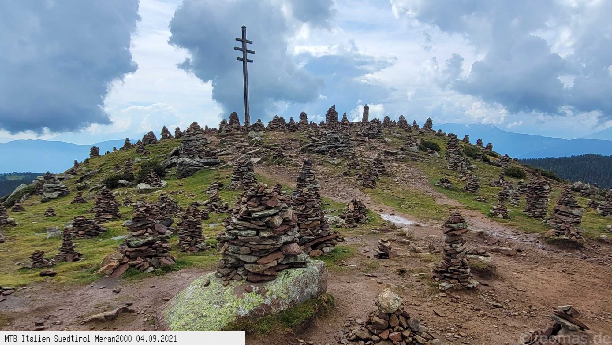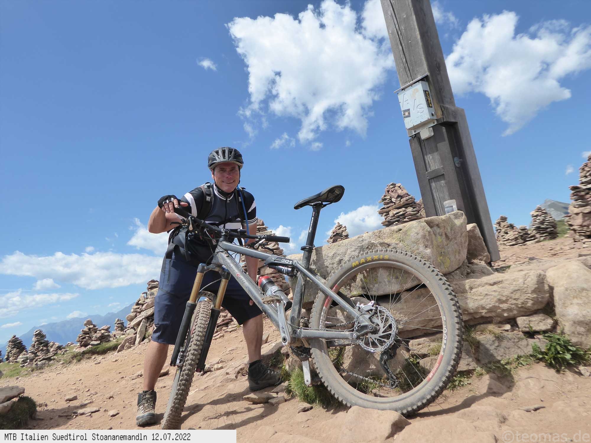 neben dem Höhenangaben Hinweisschild. Alternativ die ebenfalls schwere MTB Trail Tour vom Penegal zum Mendelpass und hinunter nach Kaltern fehren.