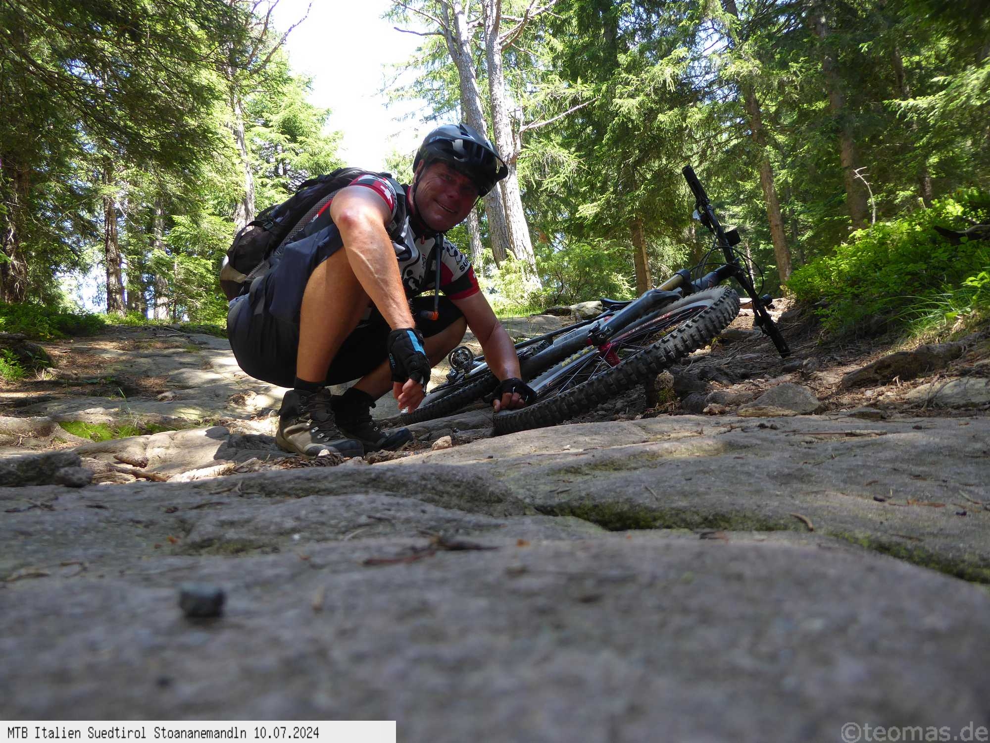 und extra spaßig! Am steilsten Stück der Abfahrt im Felsgelände einen Platten flicken.
