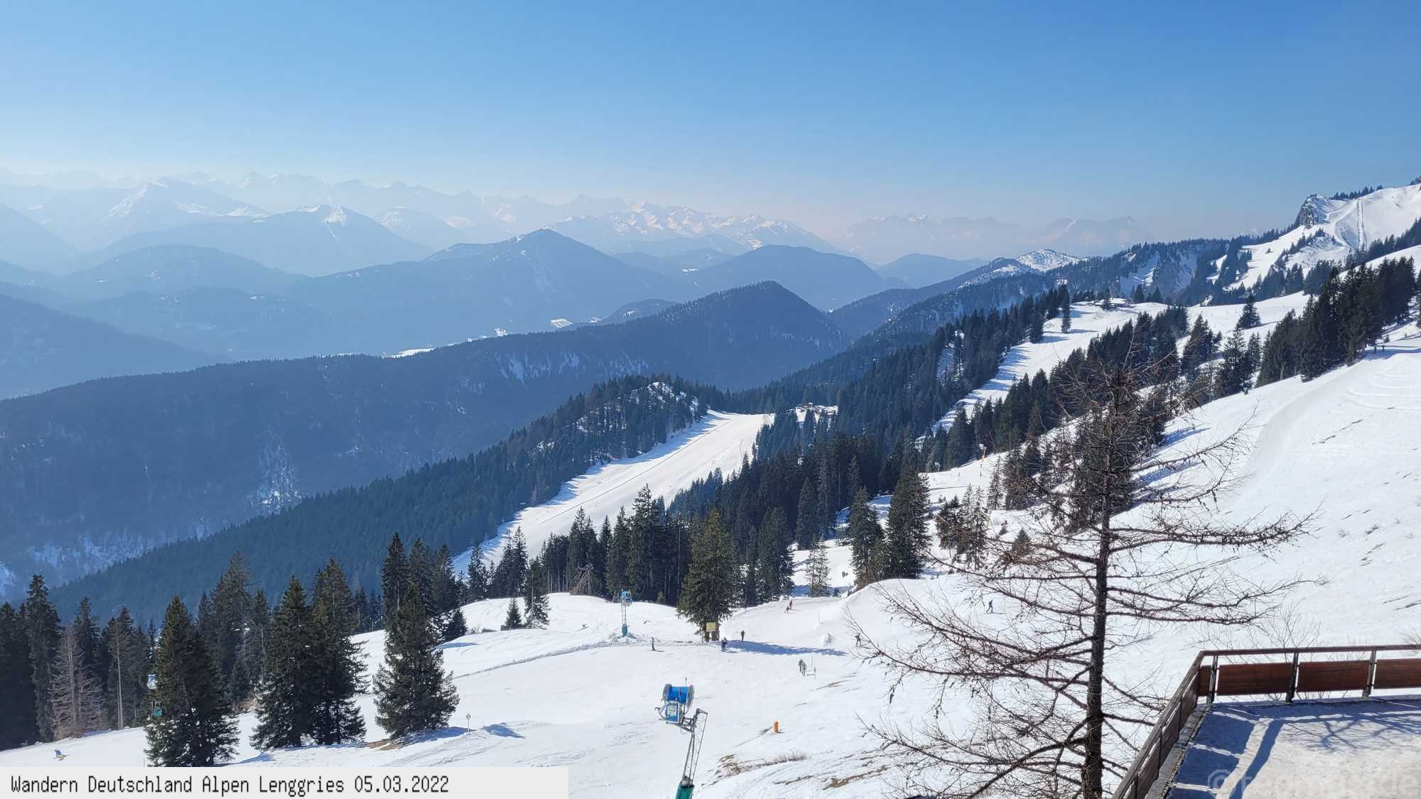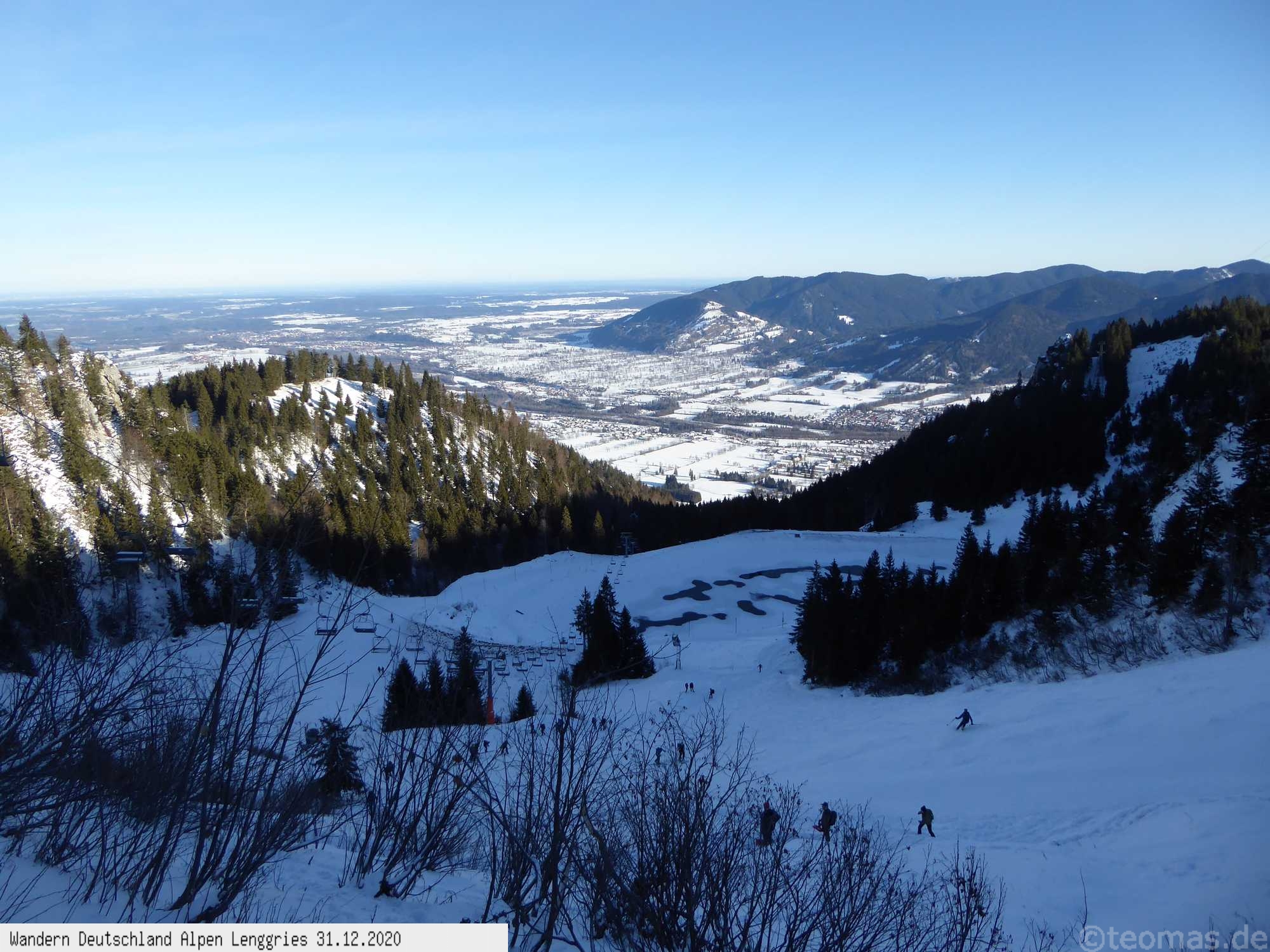Start am Parkplatz Brauneck Seilbahn Talstation und steil bergauf am Skihang bis zur Reiseralm mit Blicken auf das verschneite Lenggries.