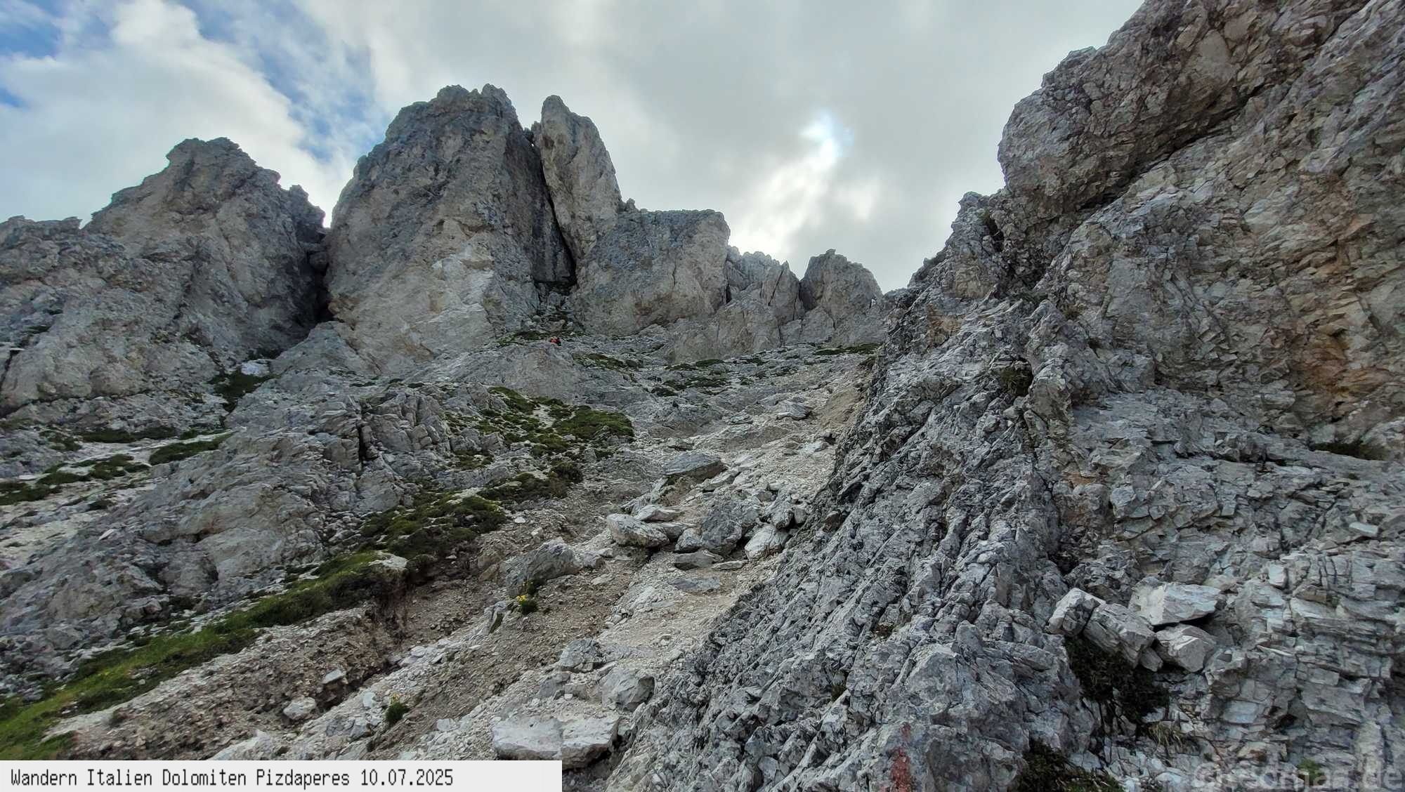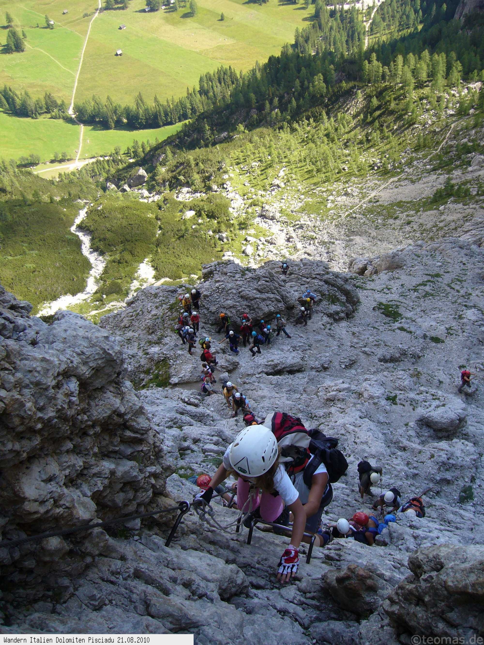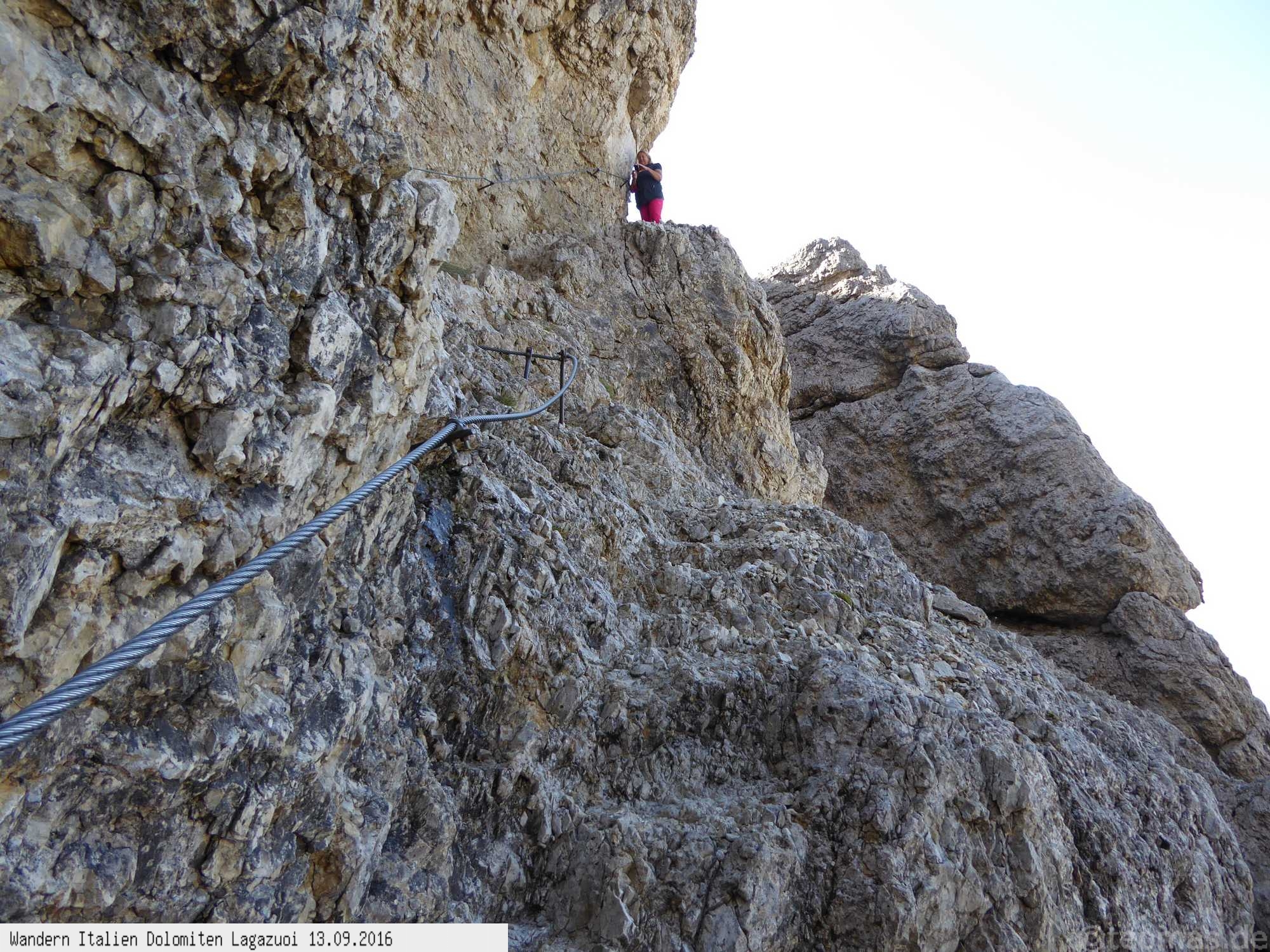 schwerer Klettersteig gekennzeichnet. Leider überlaufen, sodaß man viel Geduld braucht für die Originalroute, alternativ mittig abzweigt