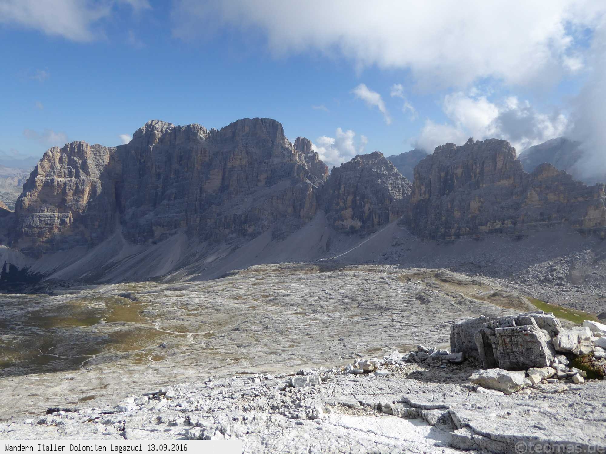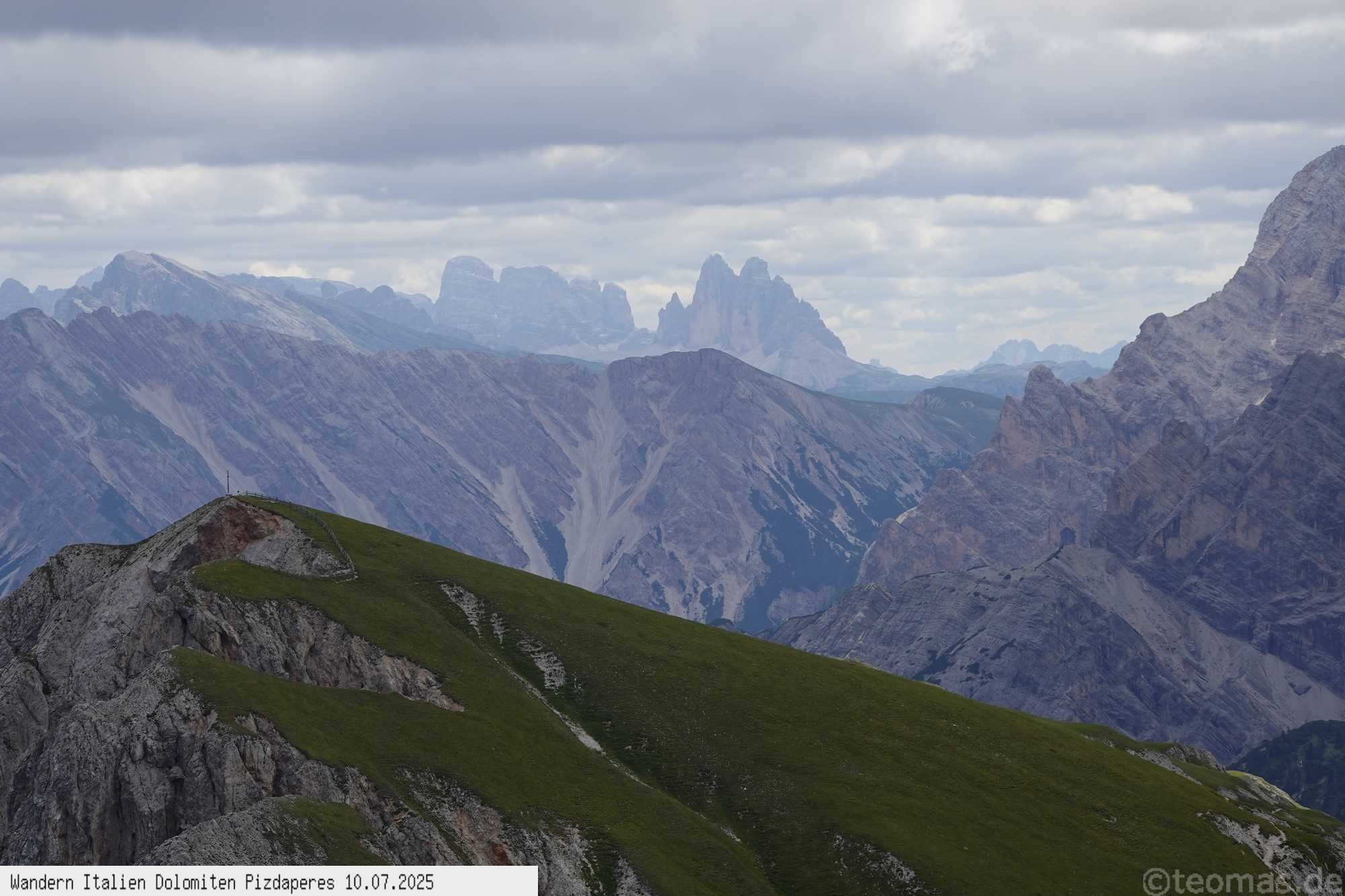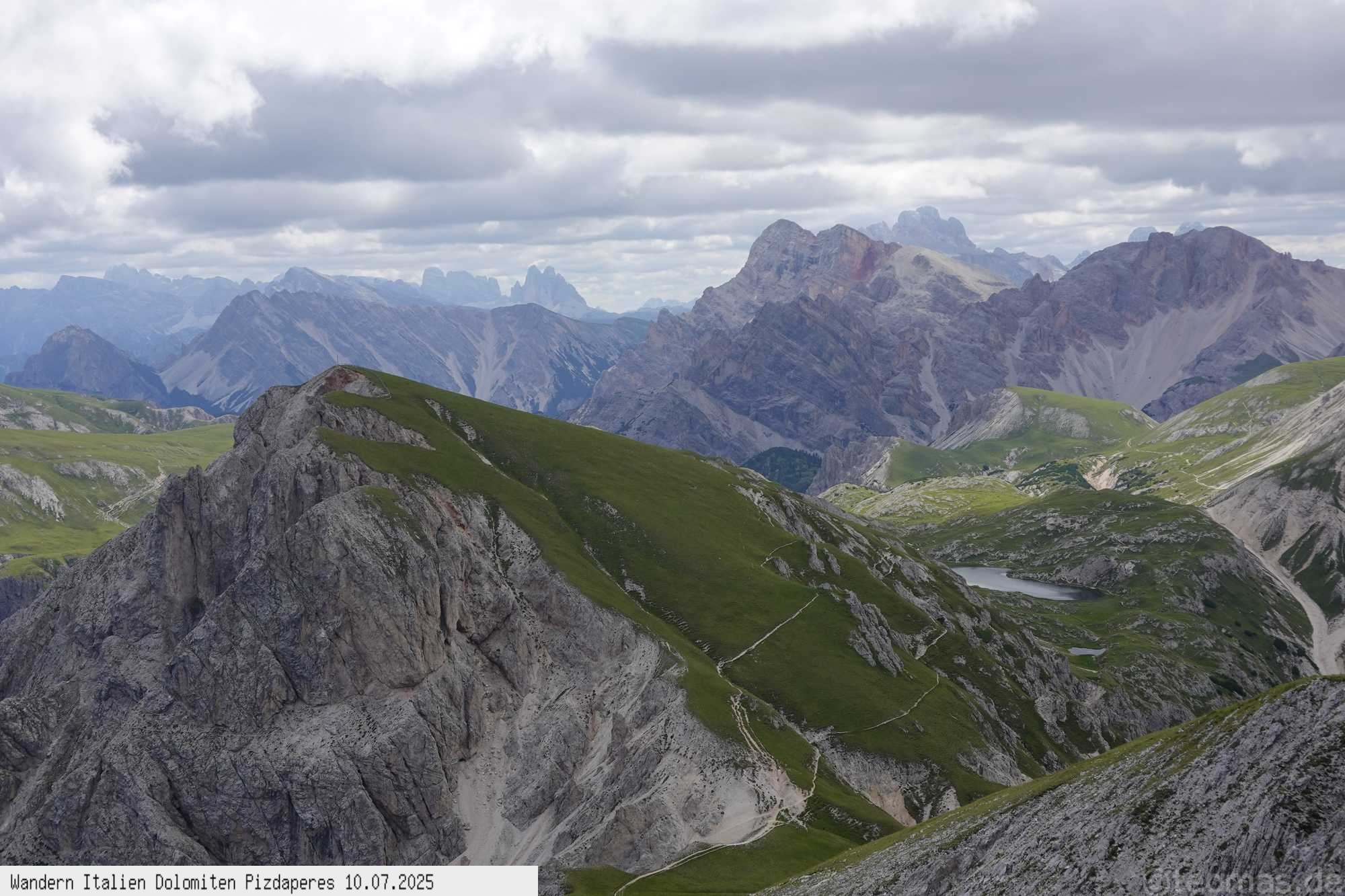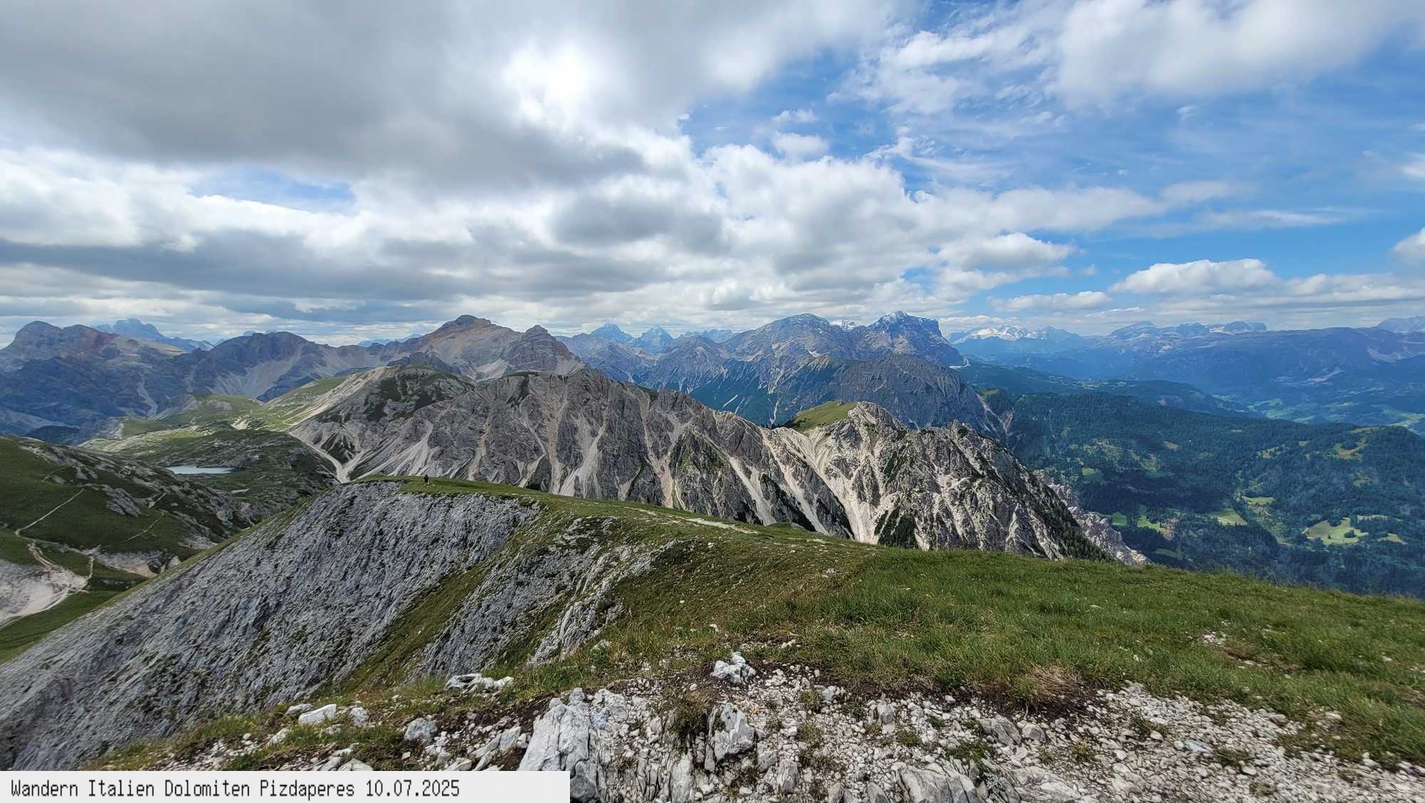 In Richtung Süden der Kreuzkofel, die Marmolada, der Peitlerkofel und viele andere Gipfel. Der Rückweg führt erst ein steiles Schotterfeld hinunter,
