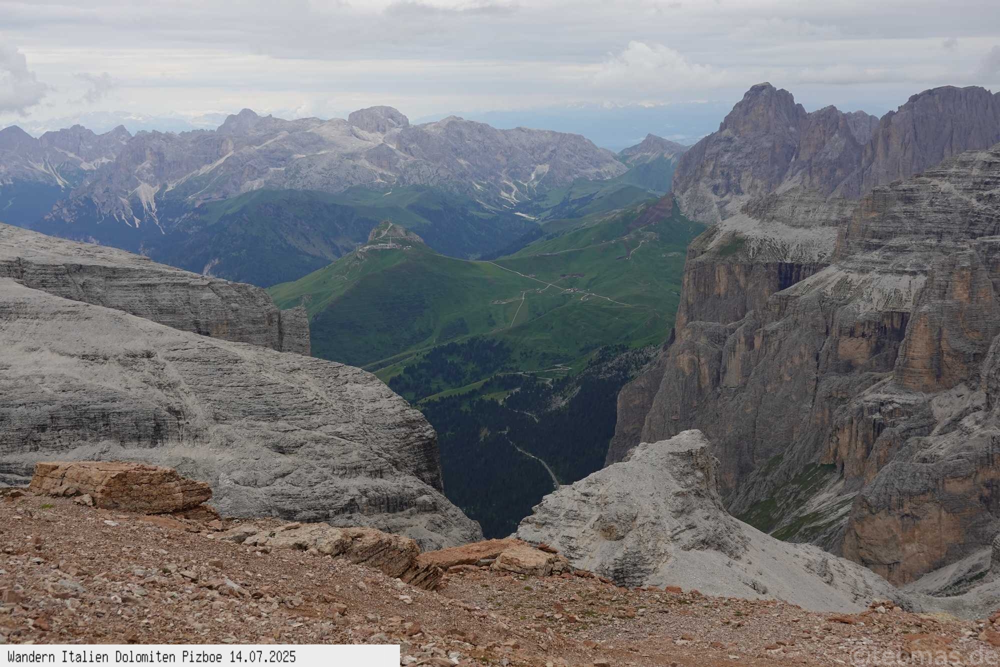 Atemberaubende Tiefblicke zur Grödner-Joch-Strasse sowie auf die umliegende Region. Gehzeit ca. 03:30 Stunden mit Aufstieg von 700 Hm und als