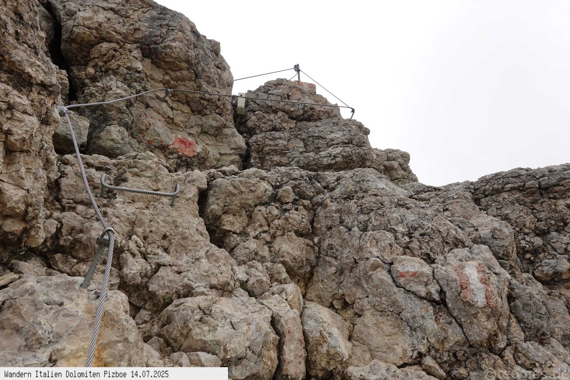 Keinerlei Seilversicherungen, im oberen Teil ausgesetzt und nur für Geübte geeignet.